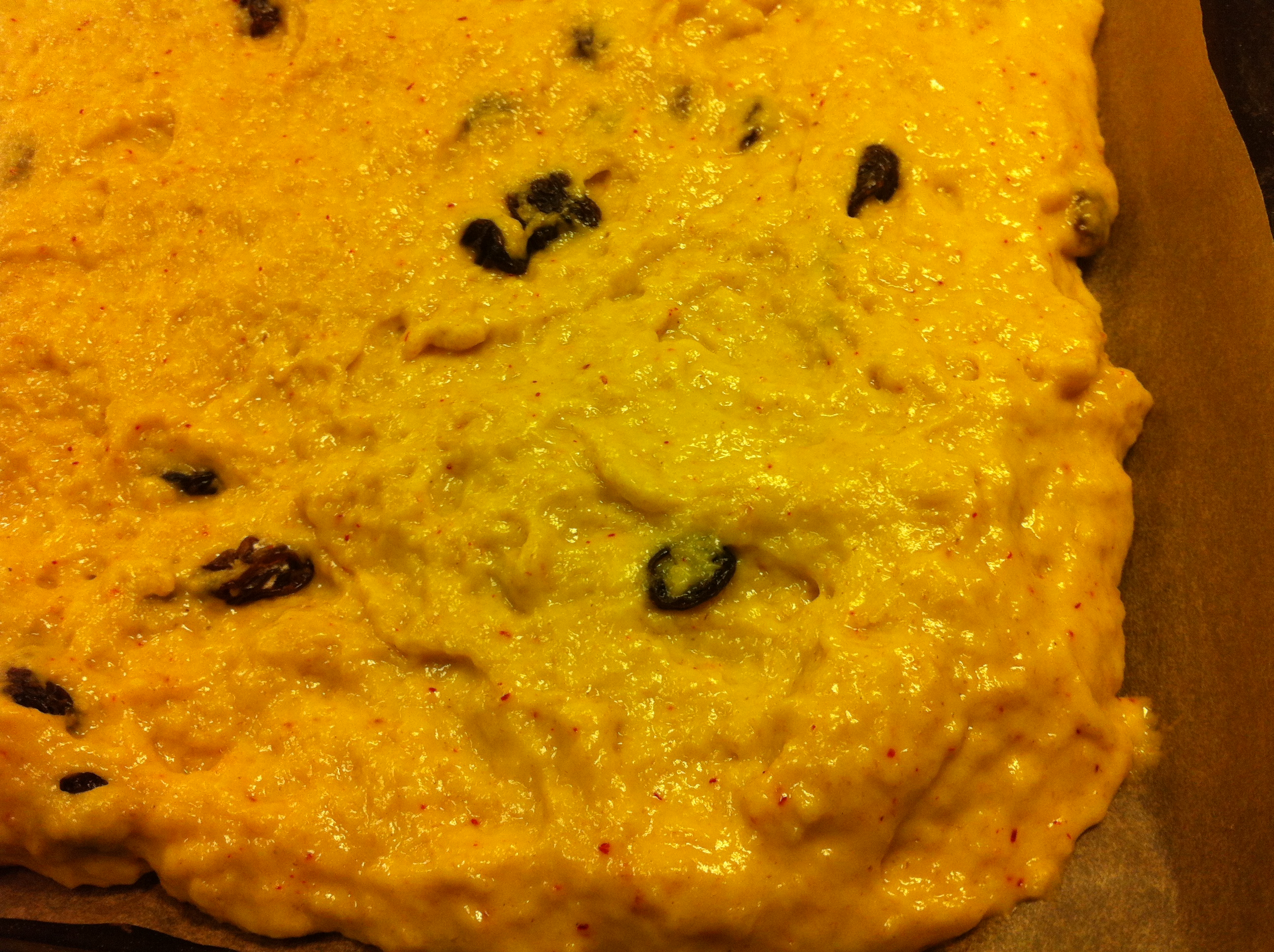 3. Rör ned socker, ägg, mjöl och russin med slev. Bullsmeten ska vara kletig. Bred sedan ut smeten på en ugnsplåt med bakplåtspapper.