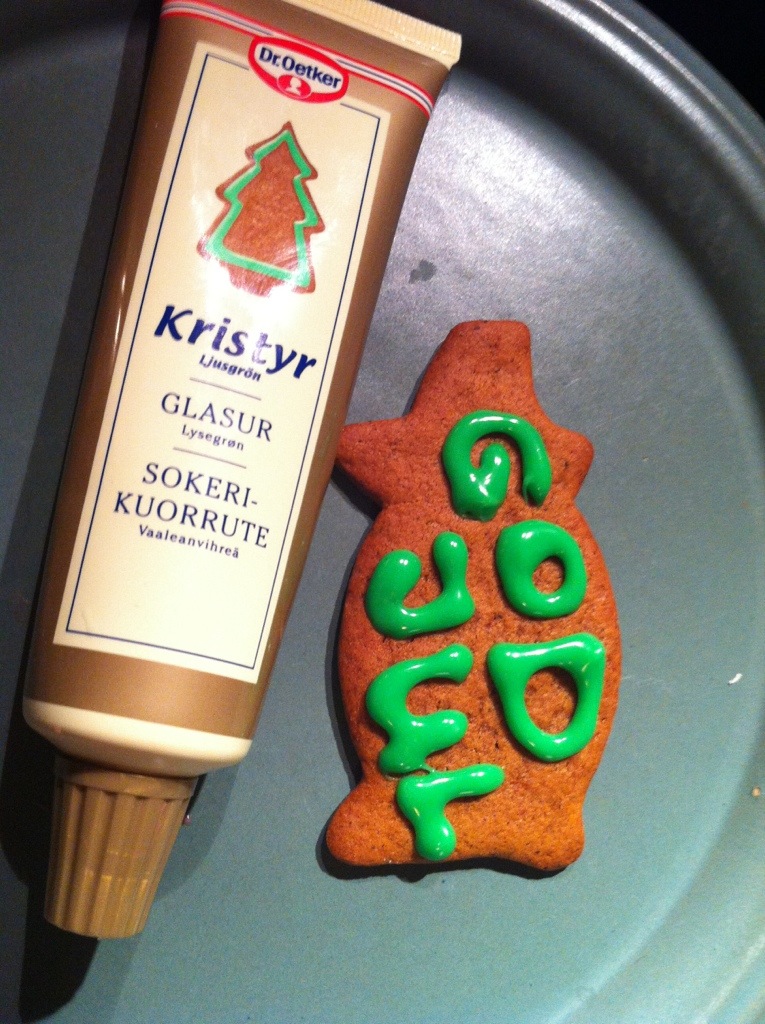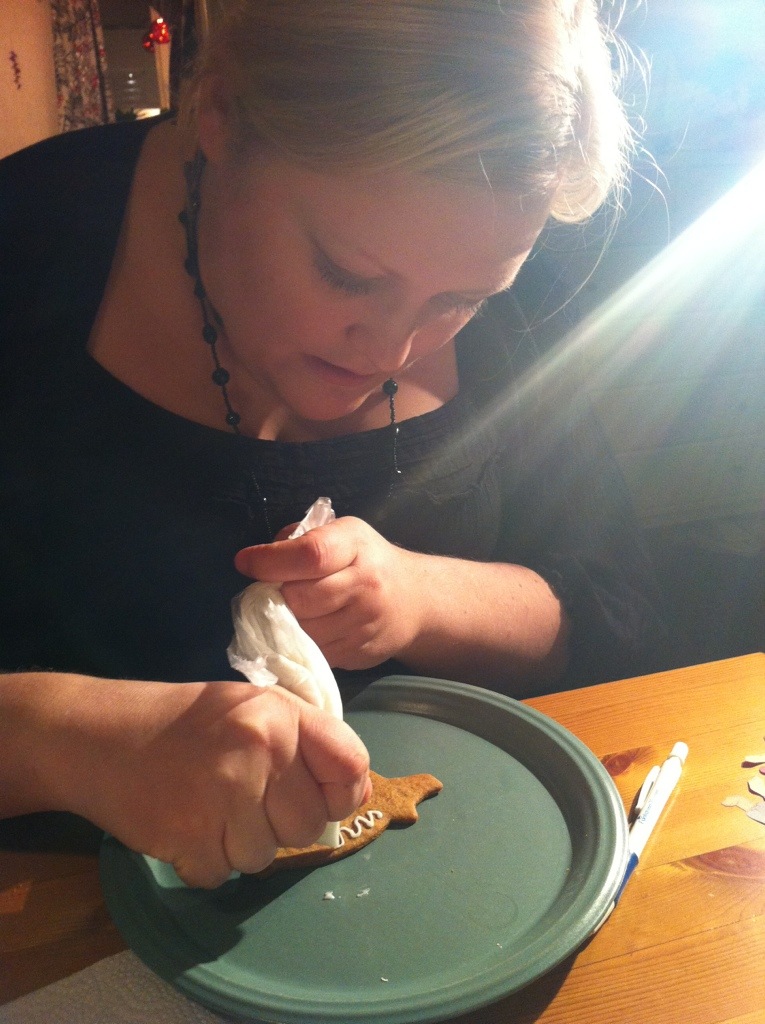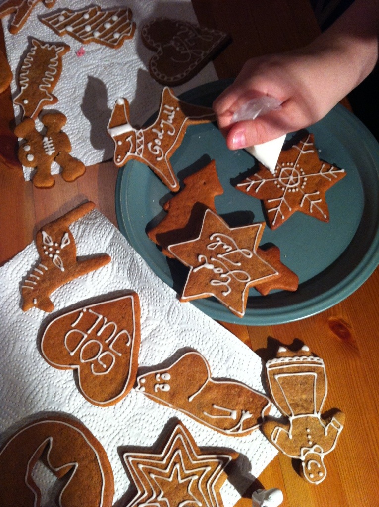 Jag hade bestämt mig för att baka och garnera lite pepparkakor, bland annat. Jag hade föreställt mig vackra ornamentrika mästerverk men det blev väl inte riktigt som planerat. Jag hade tagit med mig tuber med färdig glasyr eftersom jag fått för mig att det var svårt och kladdigt att göra egen. Det blev inte så snyggt…