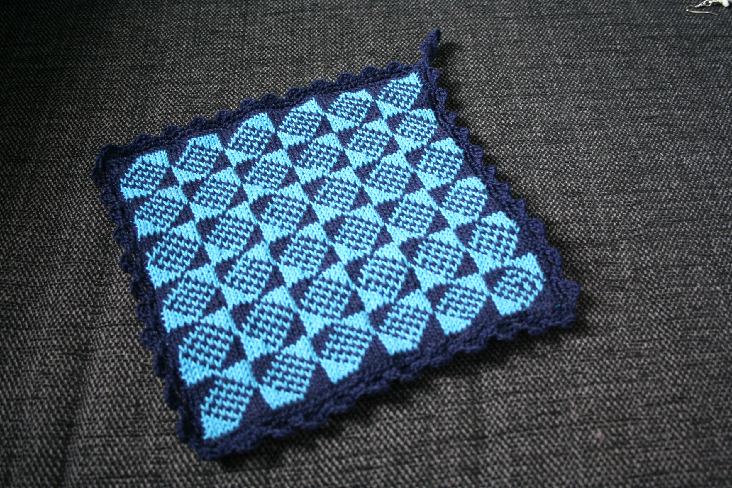 En stickad grytlapp från ett gammalt mönster från Öland. Stickad med rundsticka.