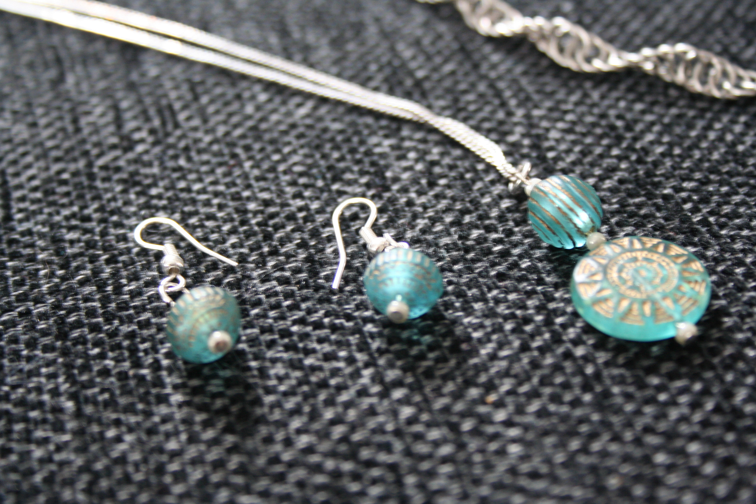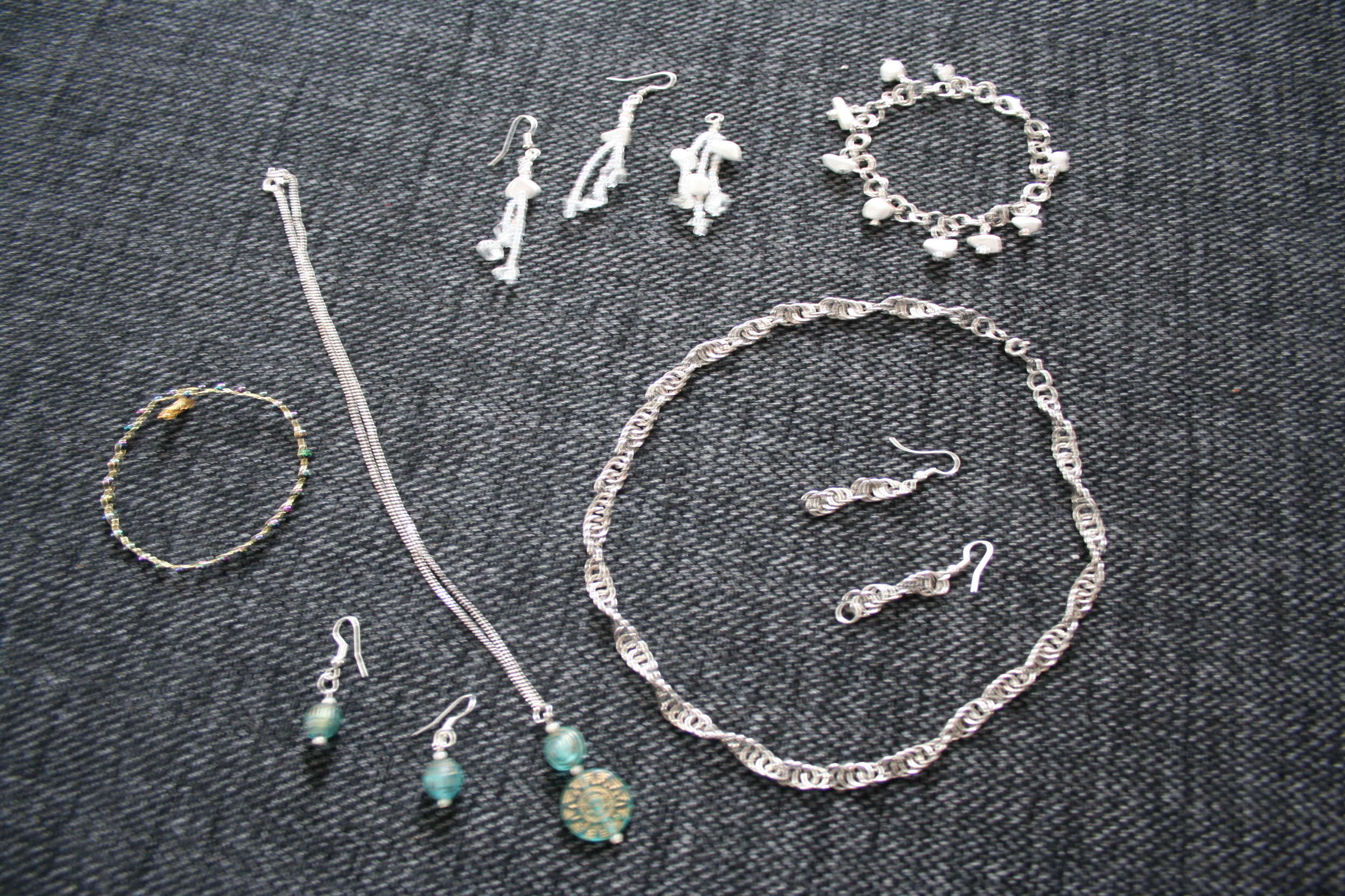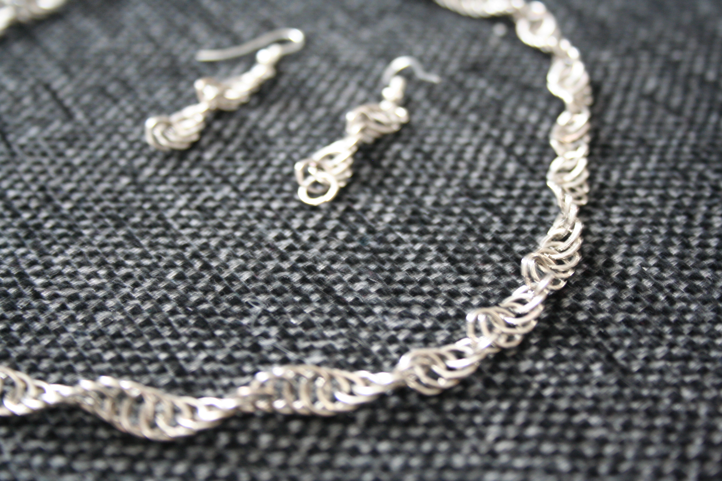 Det jag inte ärvt är mammas tålamod med pillergöra däremot. Att göra smycken är kul, men aldrig att jag någonsin kommer orka börja göra egna kedjor av små ringar på 6 mm som mamma gör. Är sjukt imponerad. Här på bilden syns ett halsband och örhängen.