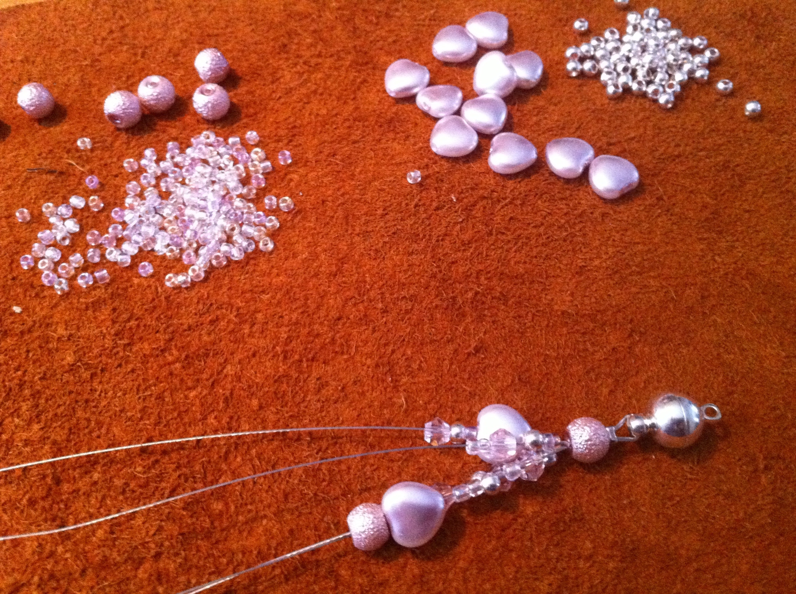 Började med ett armband med samma modell som det gula påskarmbandet. Två wiretrådar som jag viker dubbelt så att det blir fyra trådar att trä pärlor på.