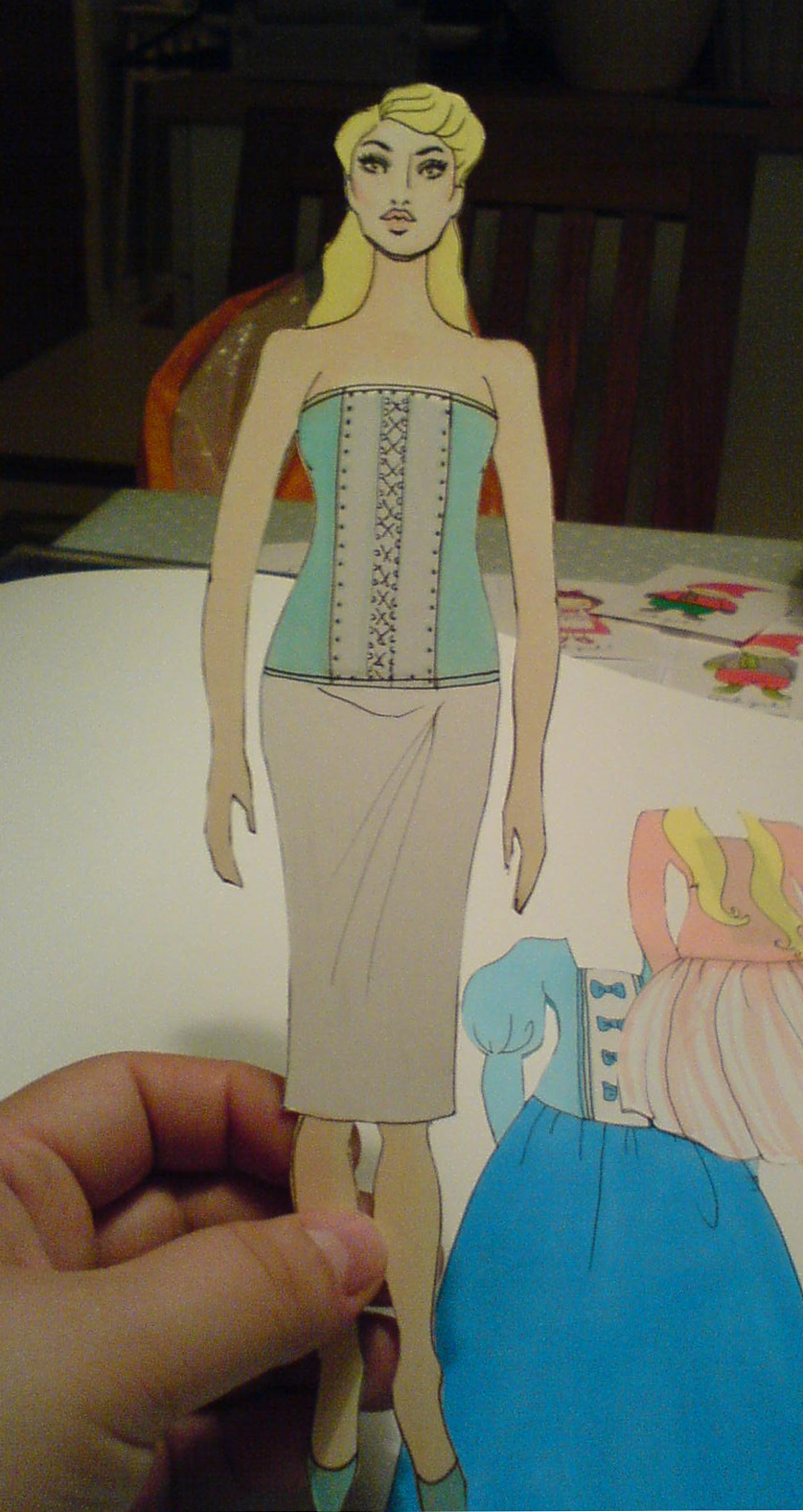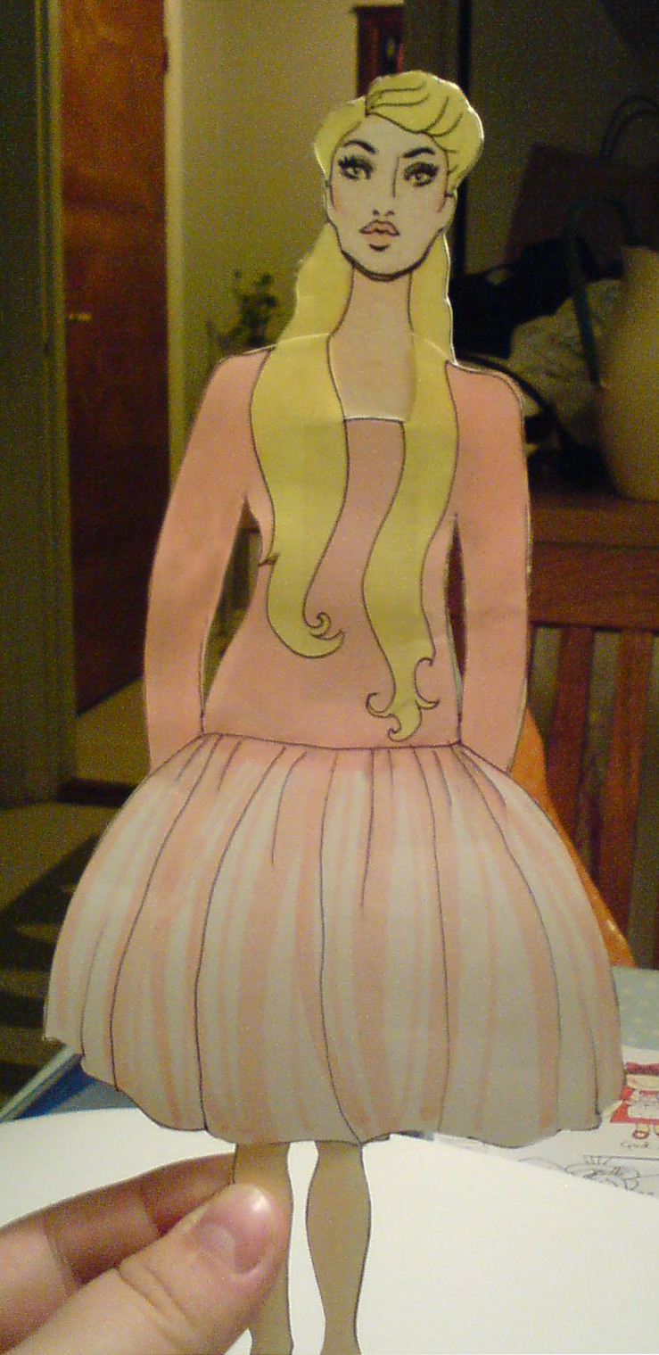 Klart! Så här blev min klippdocka först med bara underkläderna på och sedan med kläder som sitter på med hjälp av magnettejpen.
