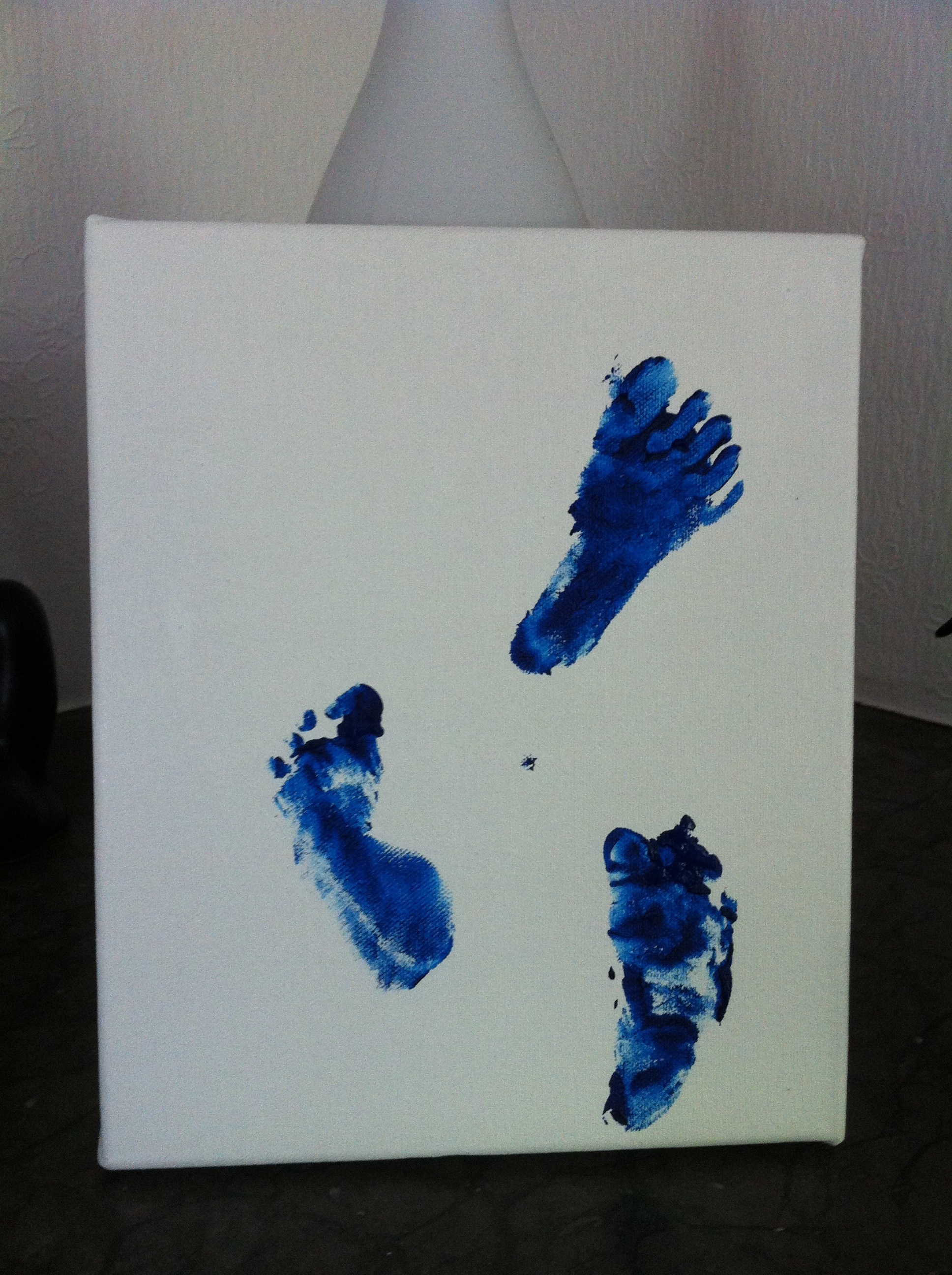 Lille Johns första pyssel blev en tavla. Lite målarduk, akrylfärg och Johns fot skapade detta mästerverk.