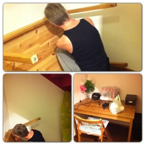 Jag bor i en rätt trångbodd lägenhet och får plocka fram och sedan bort mina pysselgrejer vid varje pysseltillfälle. Det blir ett visst motstånd när man aldrig kan låta sakerna stå framme till nästa gång då man ska fortsätta sitt projekt. Men på förslag av min kära sambo har vi nu rensat ut och inrett förrådet under trappan till ett hobbyrum. Det är inte stort men det är ändå en egen hörna och jag behöver inte städa undan till lunch och middag som jag fått göra tidigare då köksbordet fått extraknäcka som sybord. Härligt!