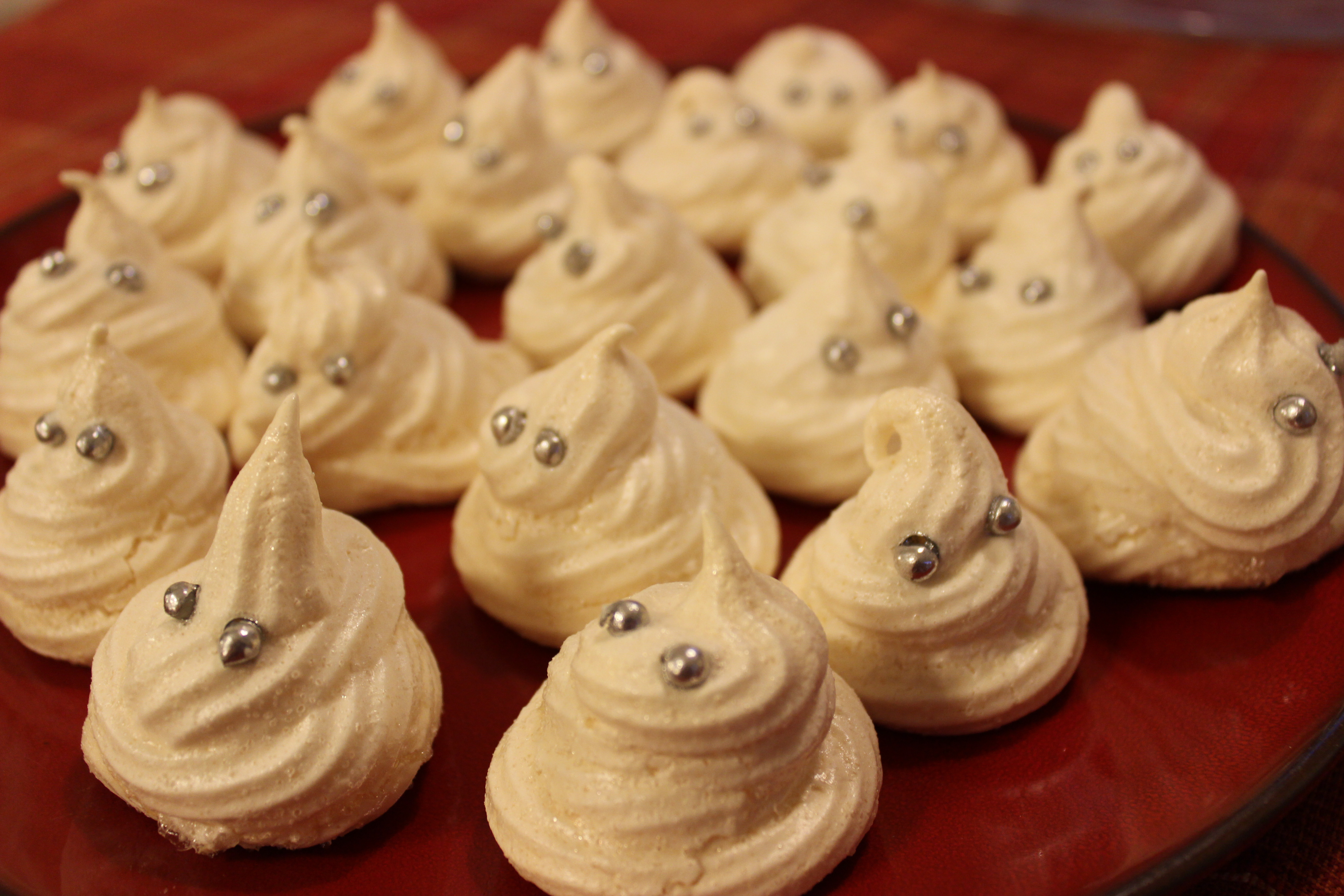 - Spritsa ut marängspöken på en plåt med bakplåtspapper. Fäst silverkulor som ögon.