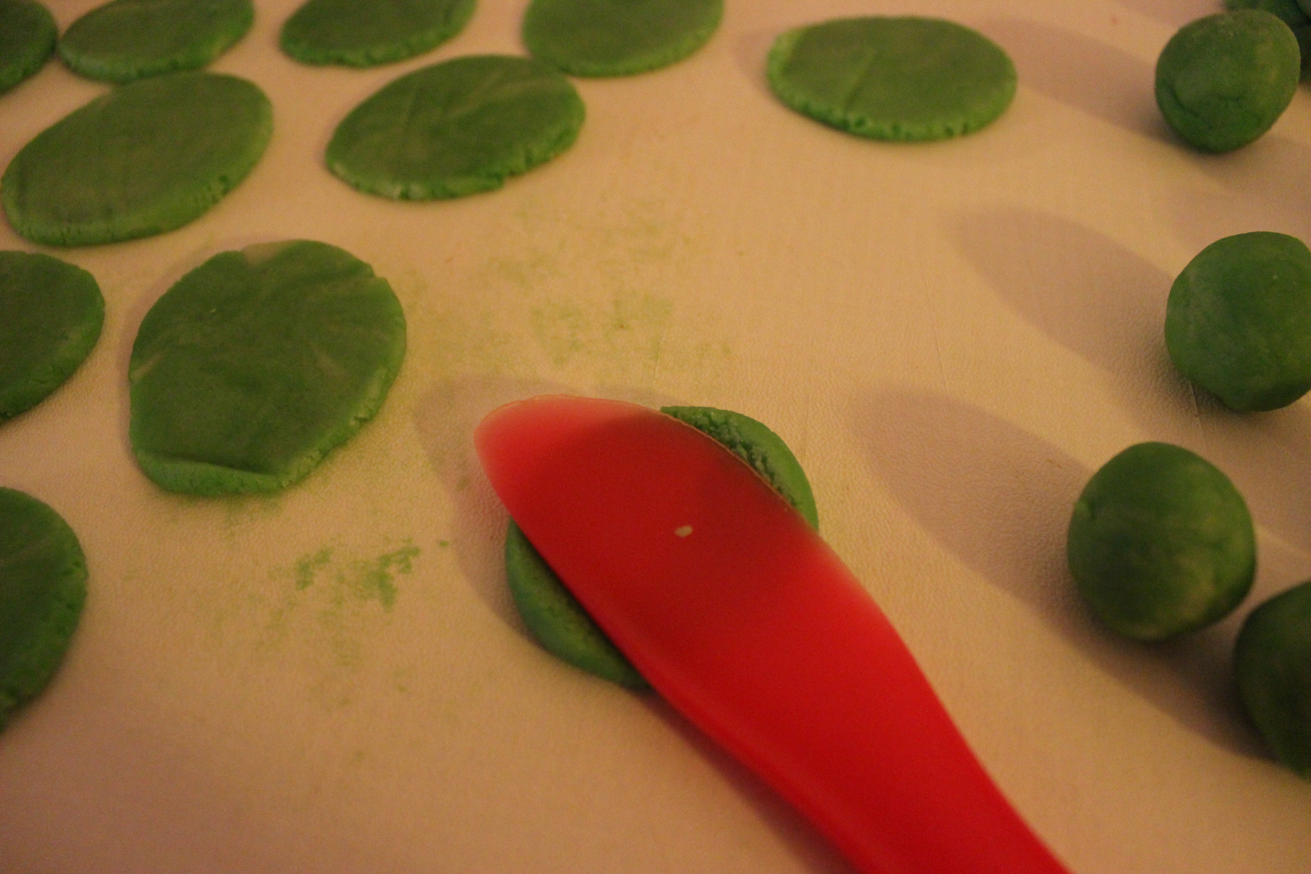 Jag rullade marsipanen till små bollar och plattade sedan till dem. Jag jobbade med en plastsmörkniv på en plastskärbräda eftersom marsipan inte fastnar i plast.