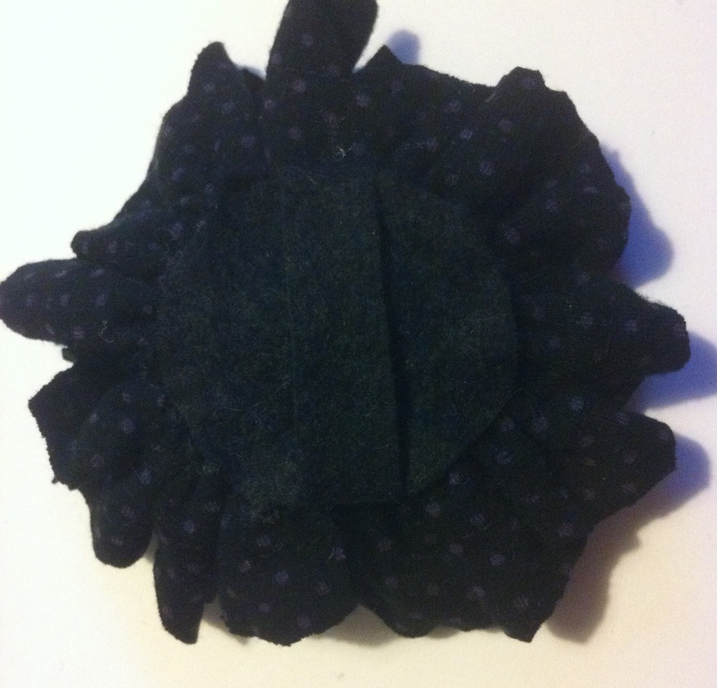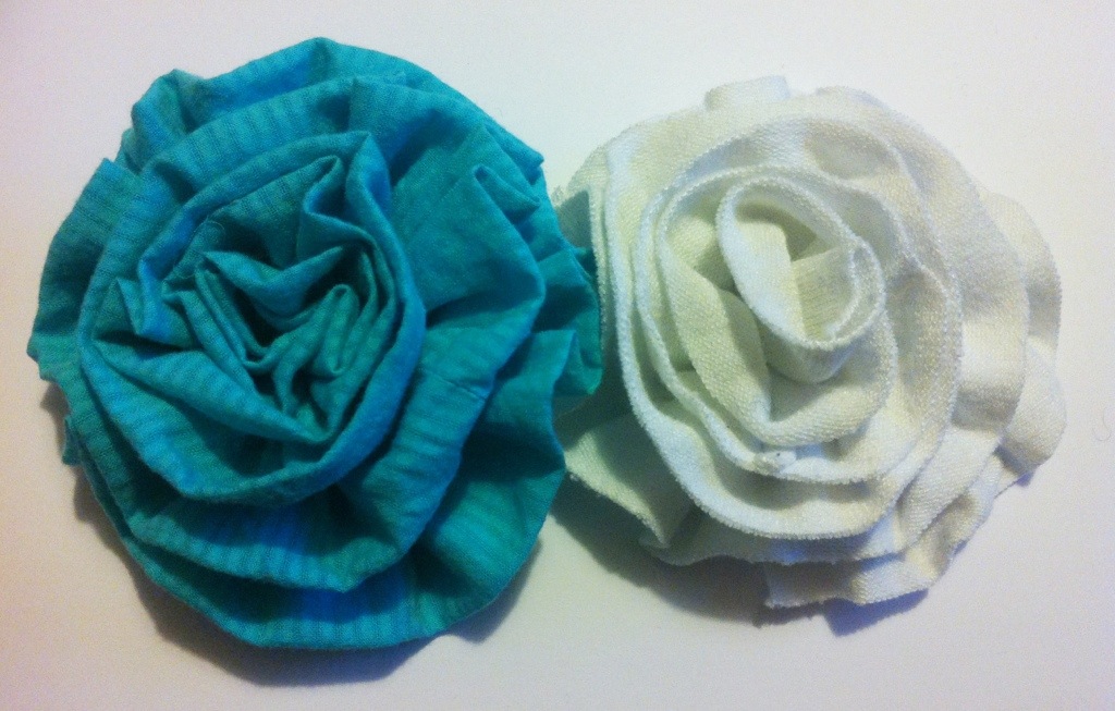 Experimentera gärna med olika material och former på remsan du gör din blomma av. Jag gillar stretchiga trikåtyger bäst utseendemässigt, och som sagt den vågformade kanten, men det är en smaksak. Med en helt rak tygremsa, istället för den vågformade, får blomman ett lite annat utseende: