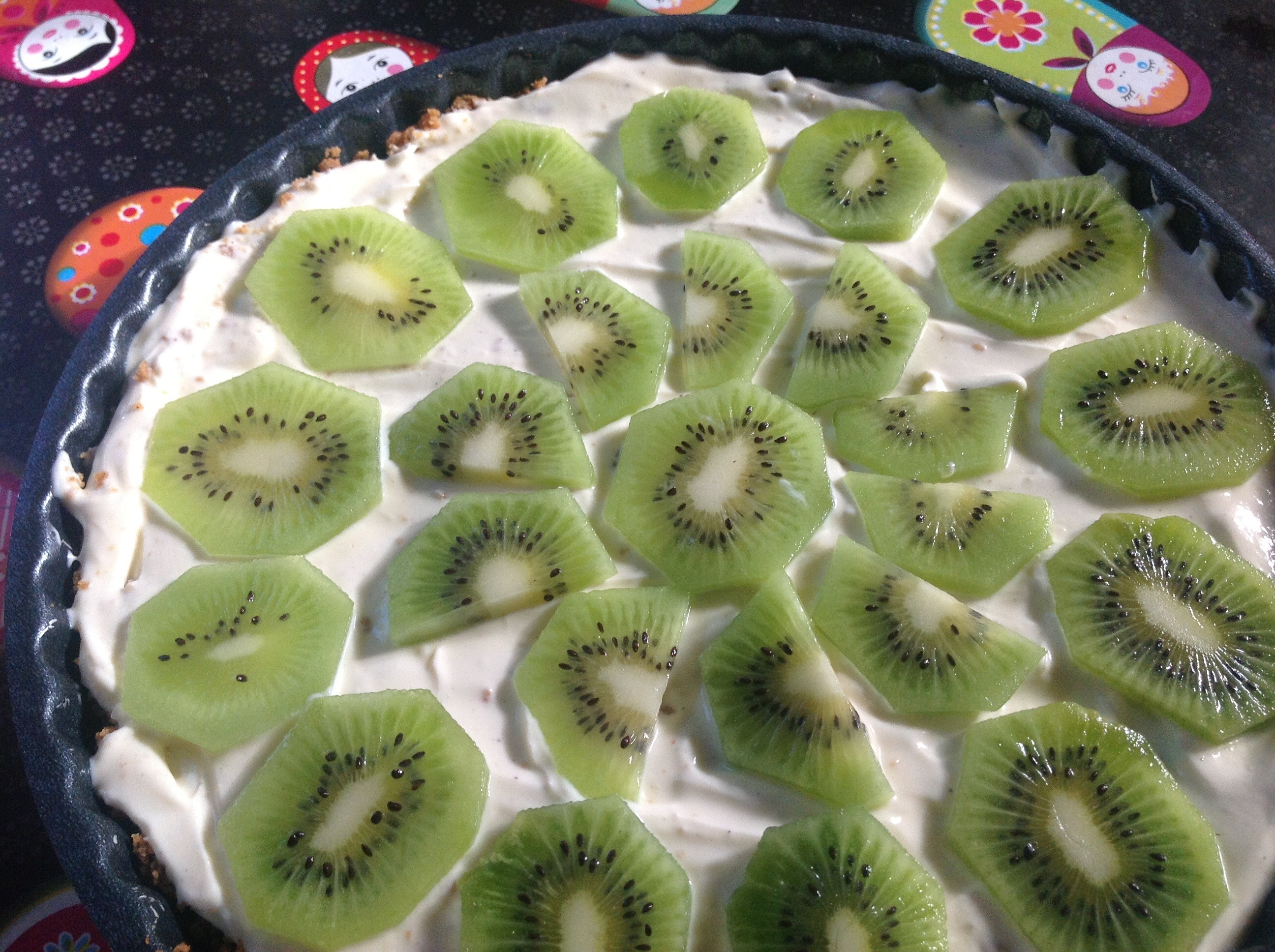 När botten har svalnat häller du på en burk vaniljkesella. Dekorera med valfri frukt eller bär. Kiwi, ananas eller färska jordgubbar är mina favoriter.