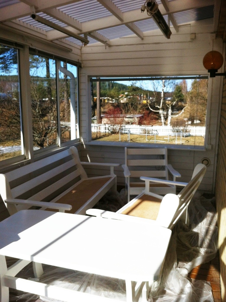 Den inglasade altanen, eller uterummet som det ofta verkar kallas, ska få sig ett lyft. Vi fick en grupp furumöbler med huset som jag bestämde mig för att måla vita. När underarbetet äntligen var klart blev det två lager vit halvblank färg: