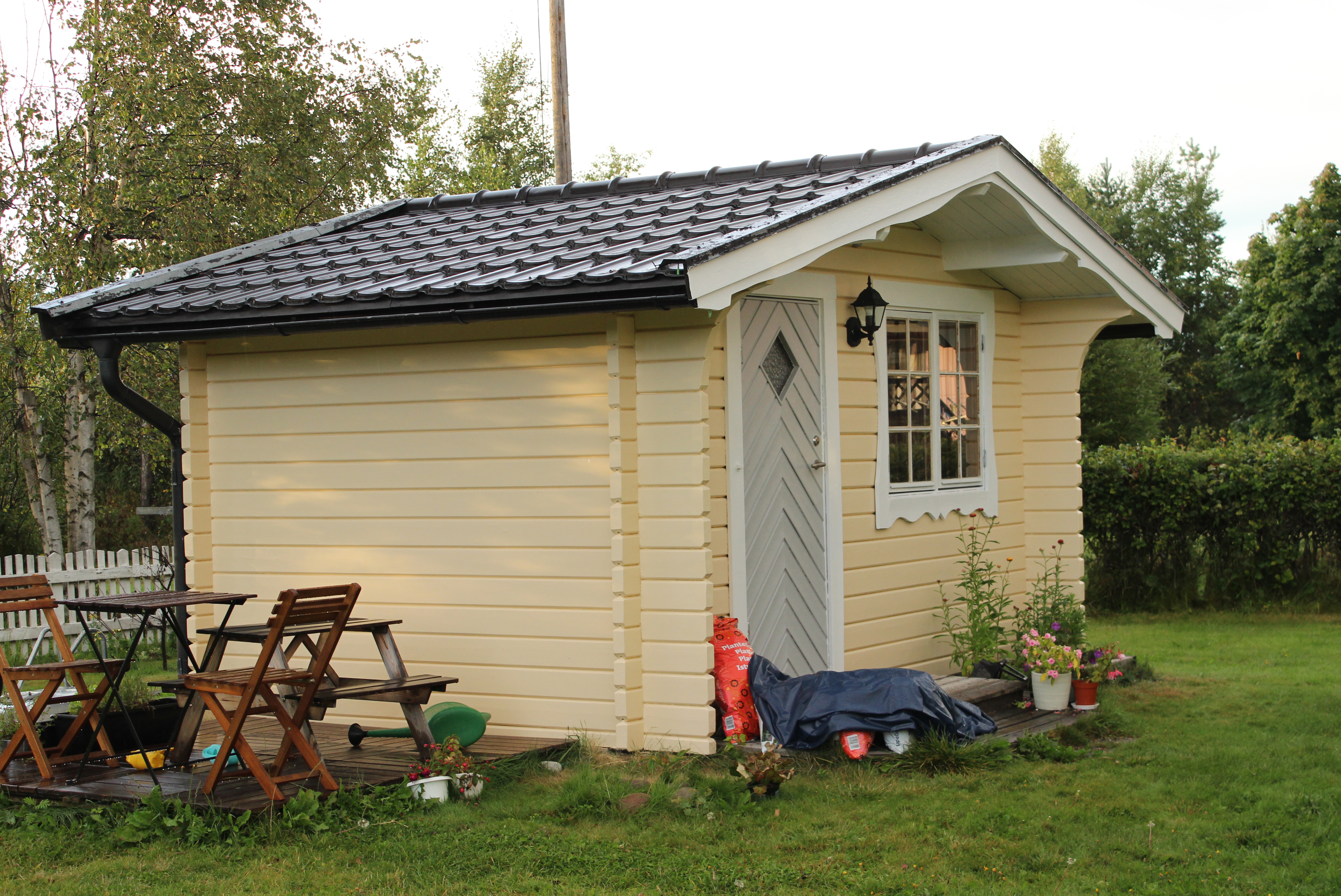 Jag valde att måla stugan i Alcro-kulören crèmegul. Den kanske blev något ljus, men jag gillar den. Dörren är en biltemafärg, mörkgrå glansig lackfärg.
