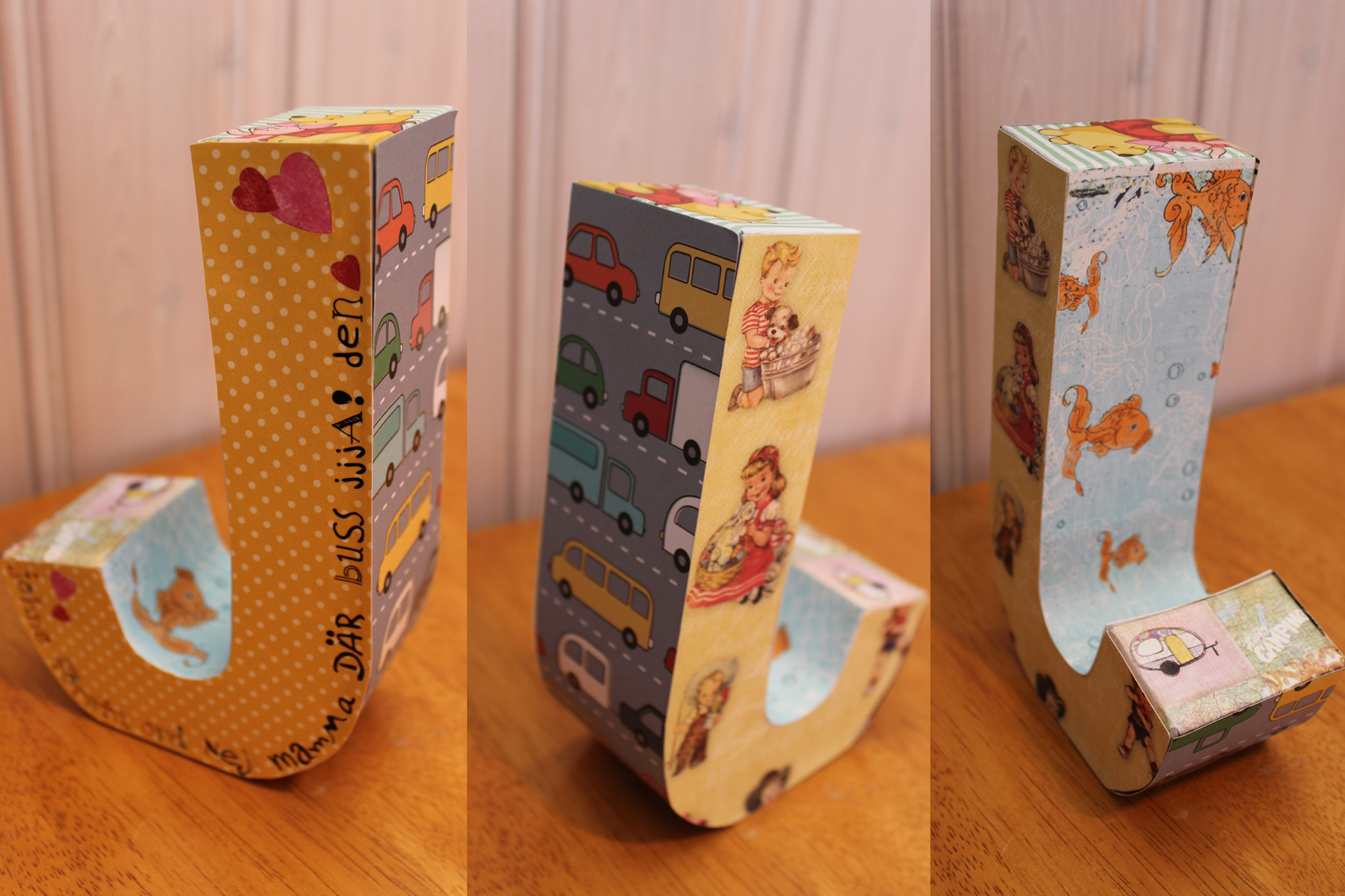 På Panduro köpte jag ett J. Det går självklart att måla, men jag har så många fina papper så jag valde att klä in det i papper som på något sätt har en koppling till John.
