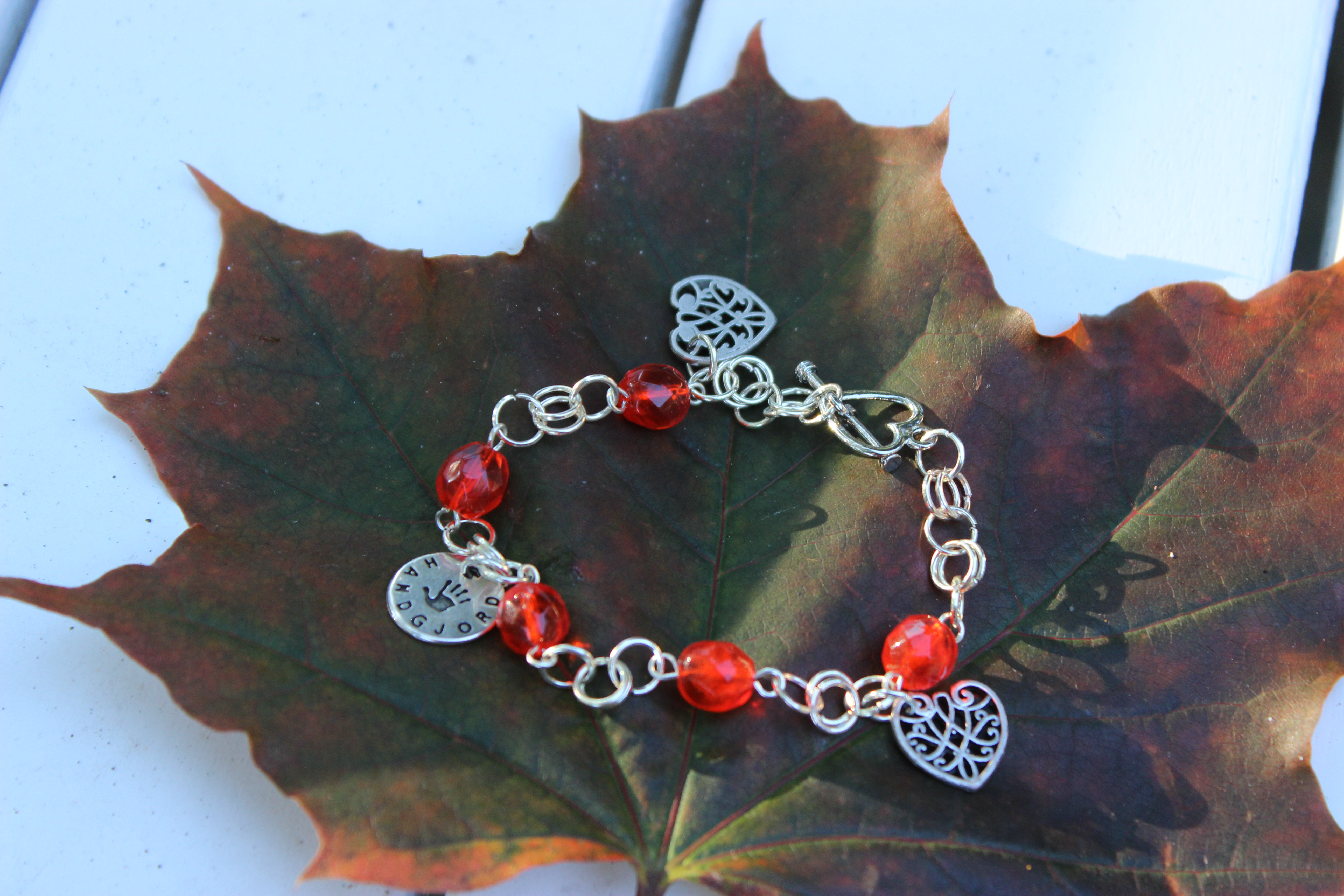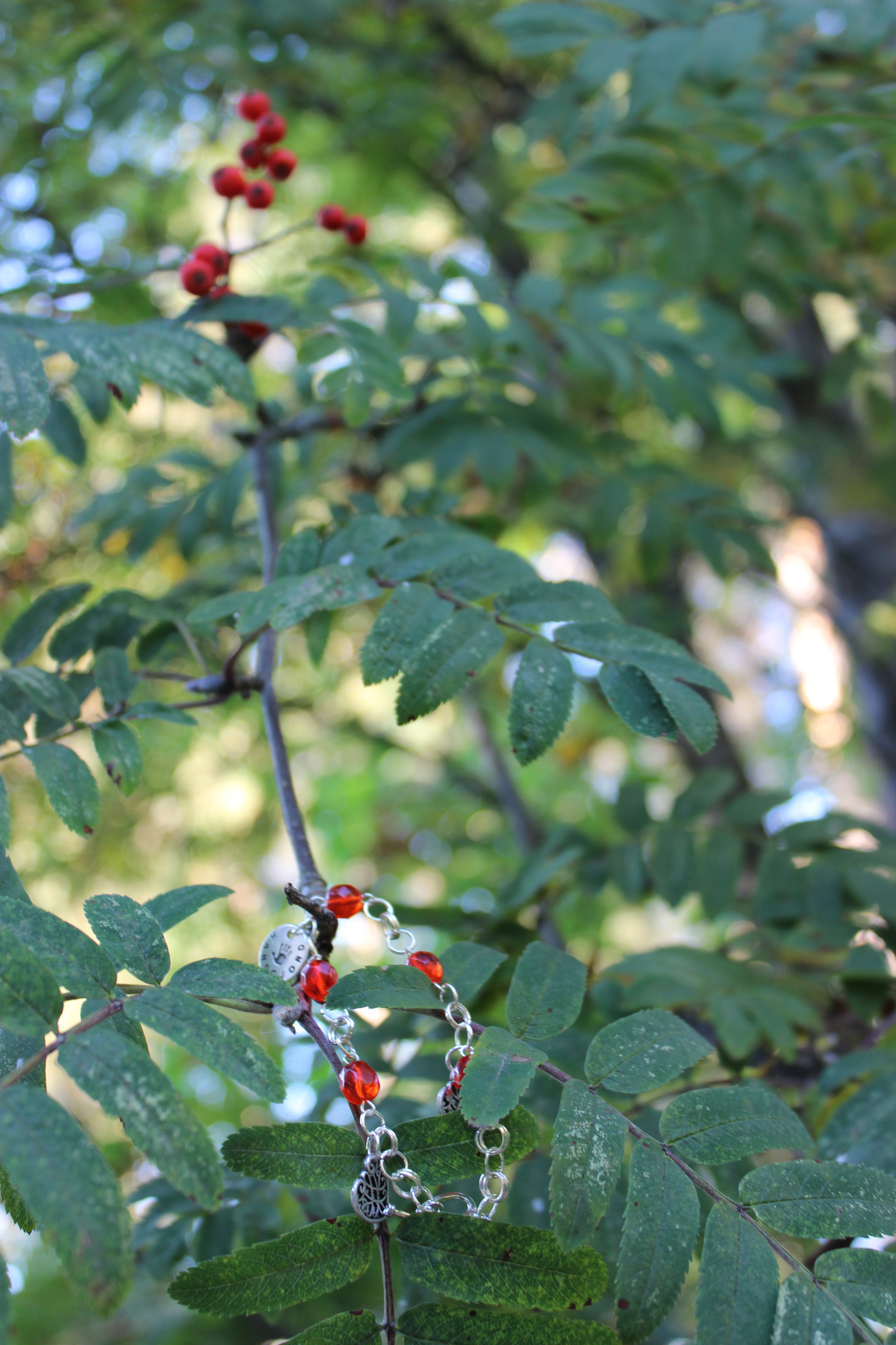 Här är resultatet (försökte ta konstnärliga bilder ute, gick så där… det blåste för mycket för att skärpan skulle bli rätt, ville ändå visa att jag inspirerades av höstens rönnbär när jag valde pärlorna till armbandet):