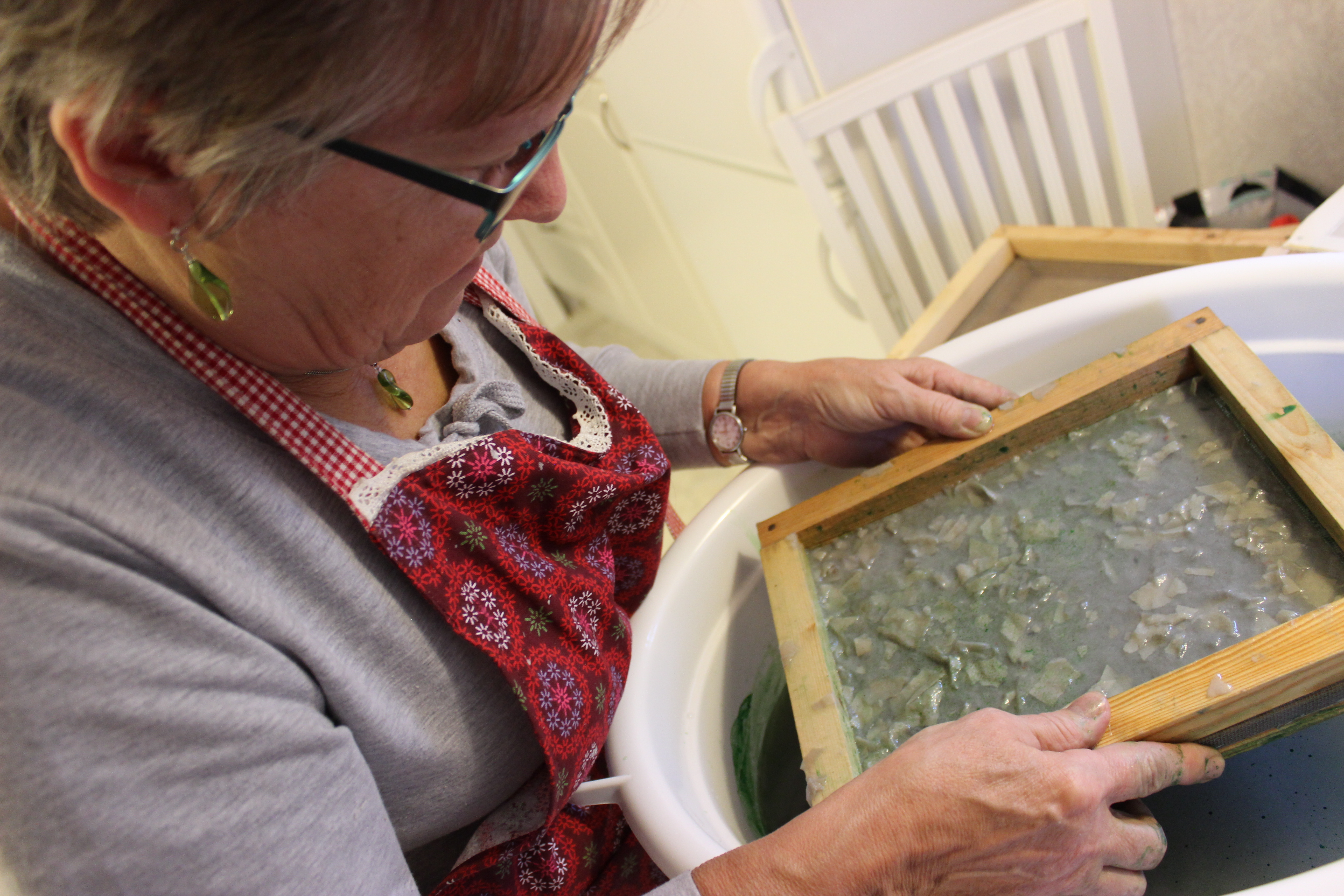 Nu har papperbitarna varit i blöt och mamma och vispat sönder bitarna. Dags att färga.