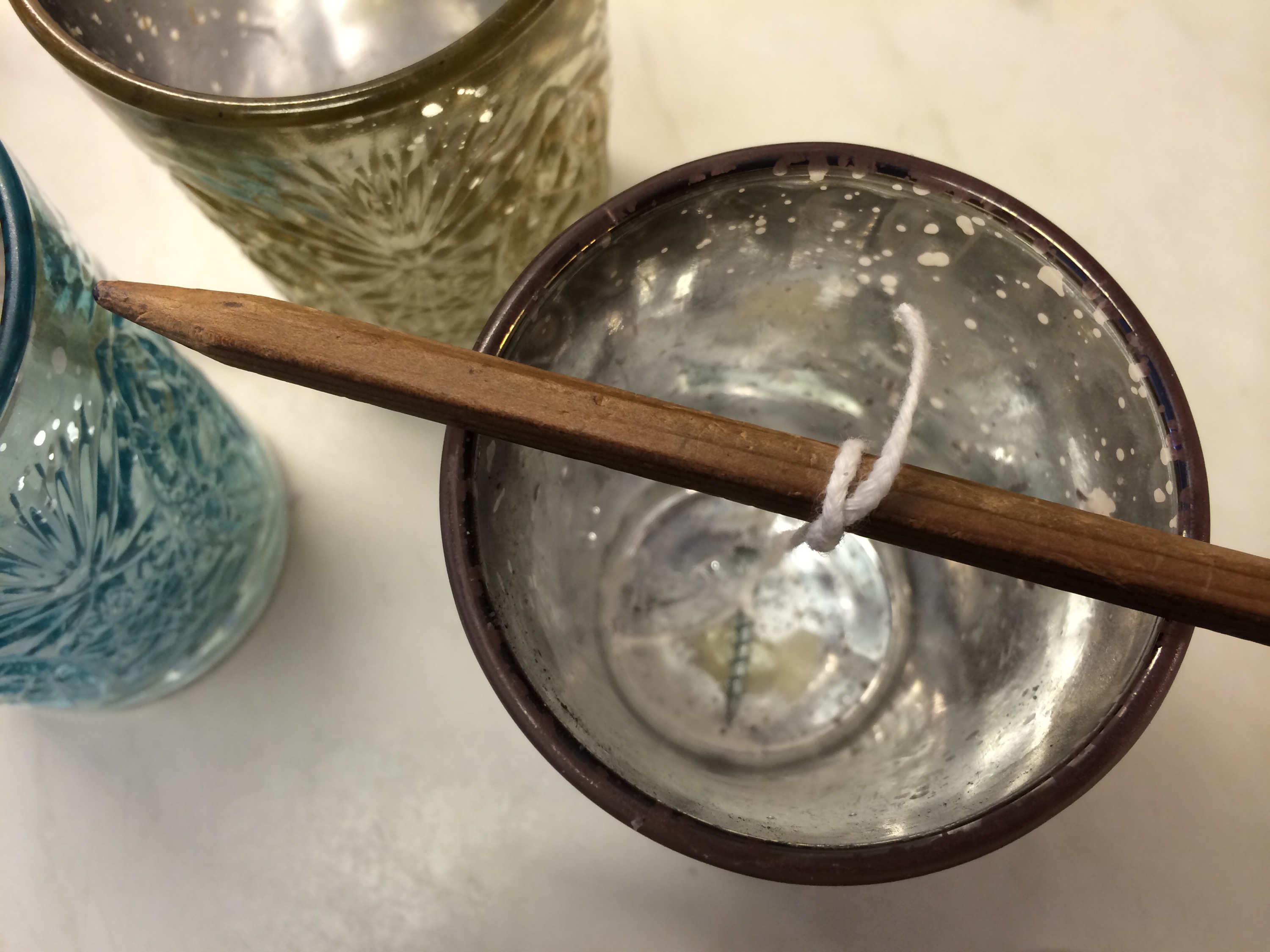 Jag återanvände gamla ljushållare. Nya veken hålls på plats med skruv i botten och penna i topp.