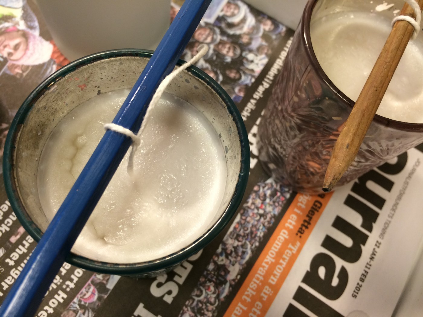 Sedan är det bara att hälla i ljusmassan och låta den stelna.