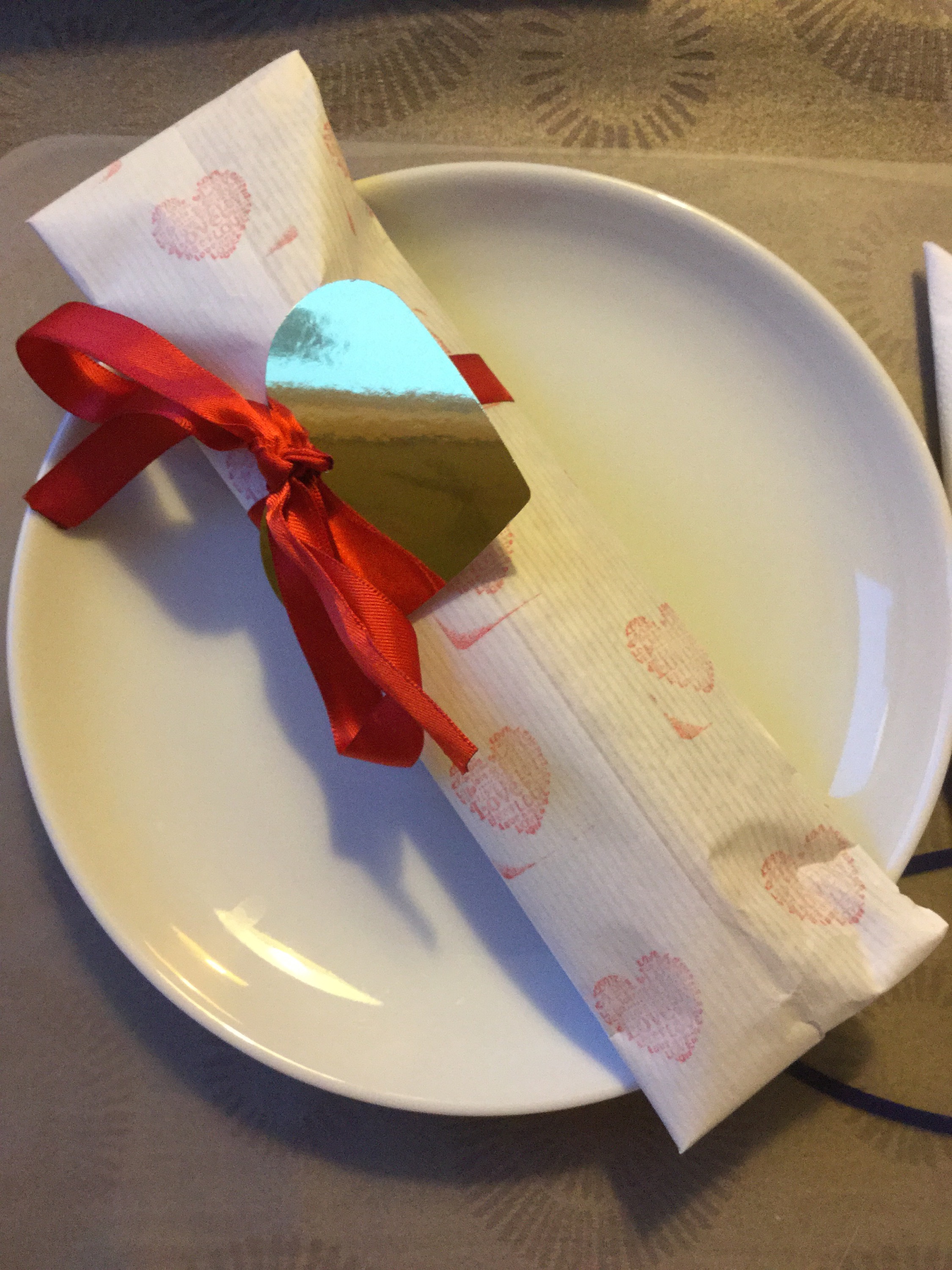 Hjärtpyssel i enklare skala blev det igår. Jag stämplade röda hjärtan på vitt paketpapper och stansade ut hjärtan i kartong till presentetiketter. Stämplarna köpte jag på Ica Maxi. I morse klev jag upp och gjorde frukost till familjen och dukade då också fram paketen.