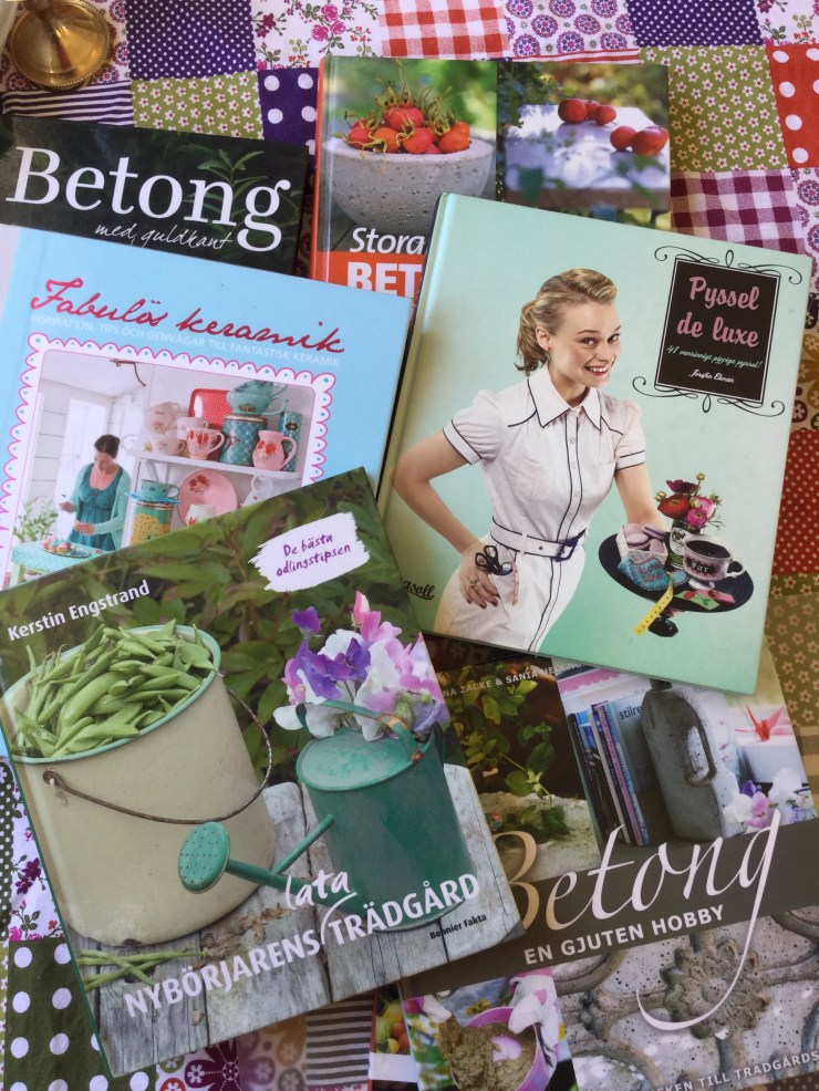 Kommunens bibliotek har mängder med böcker om sömnad, virkning, betonggjutning, allmänt pyssel. Ja, allt man kan tänka sig. (Betonggjutning har jag plötsligt blivit sugen på att testa, men har ingen aning om det är svårt eller inte. Har aldrig provat.) Jag kom hem med en lite för tung påse, och tog sedan en tur till Panduro och Ikea och kom hem med en lite för tunn plånbok. Nu är jag redo för pyssel! Jag återkommer med resultatet senare… Om det inte blir helt misslyckat. 🙂