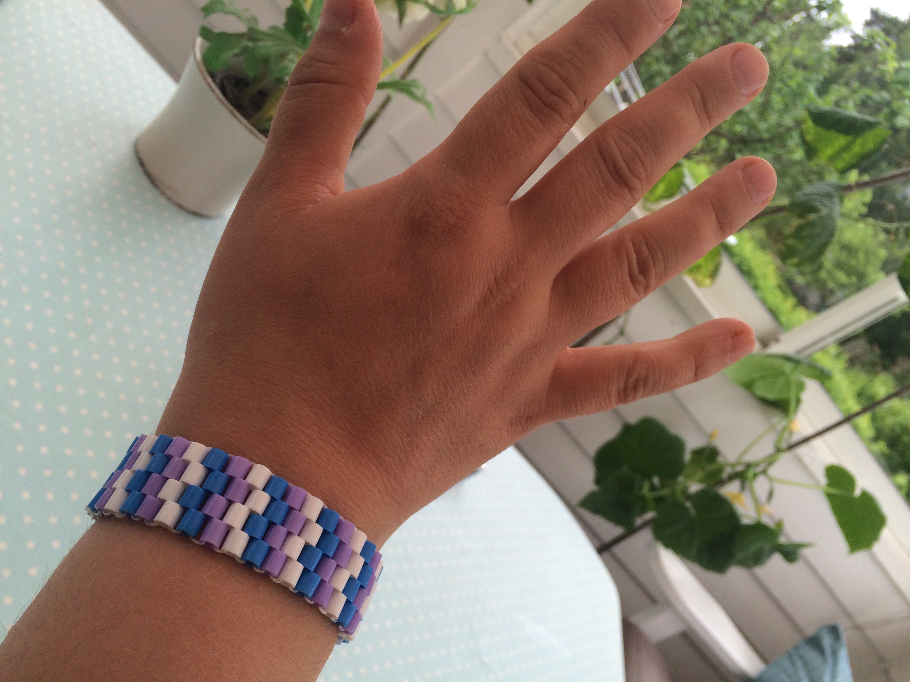 Jag hittade en beskrivning på hur man kan göra armband av vanliga pärlplatte-pärlor på nätet. Jag testade först med den vanliga sortens pärlor. Det är bra att använda elastiskt band, så behöver man inget lås.