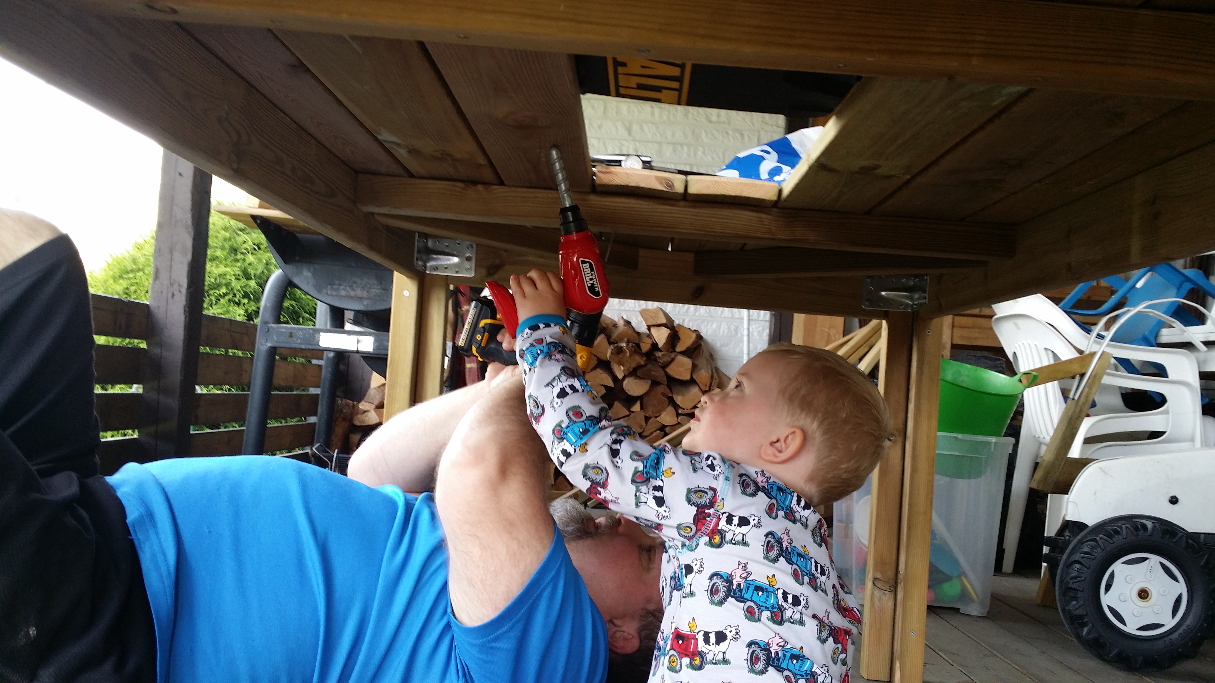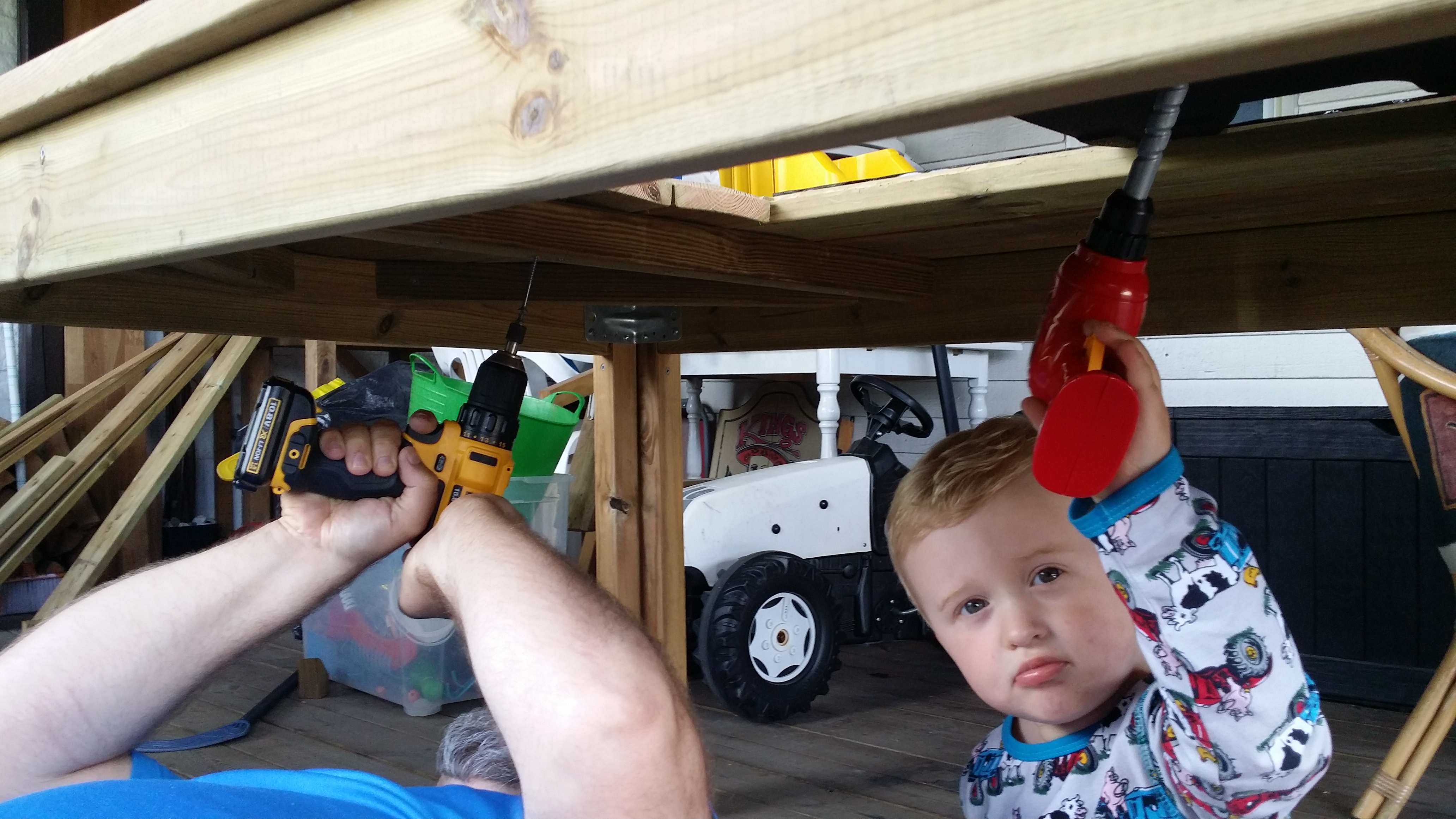 I sommar pysslade han med sin son, något som passar sommarutmaningen. Med en återvunnen infälld glasskiva från deras gamla ytterdörr blev bordet riktigt fint.