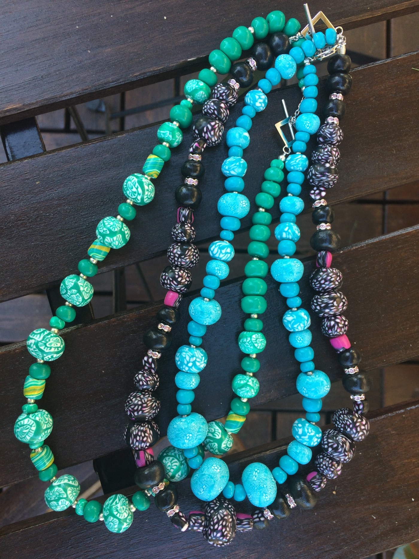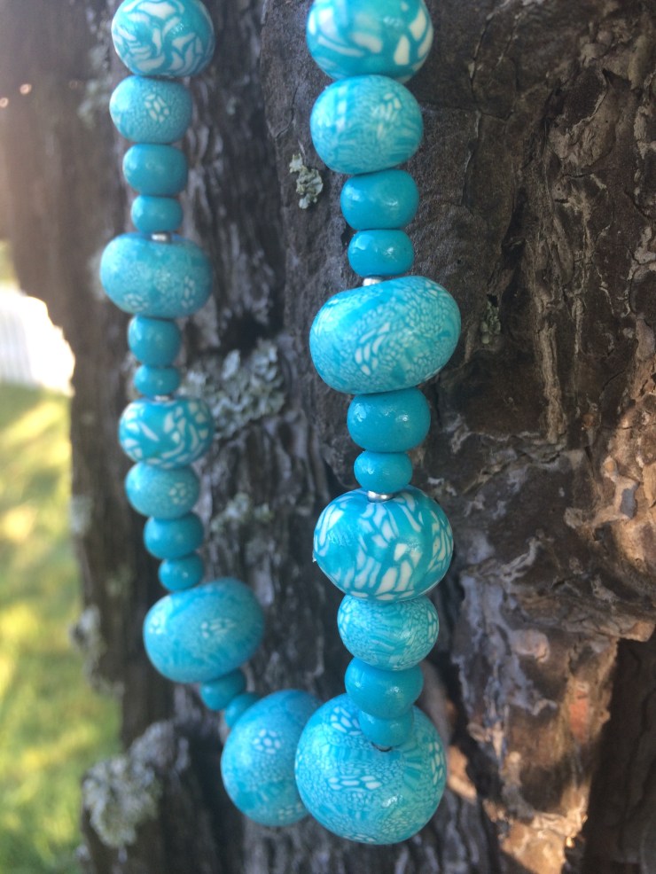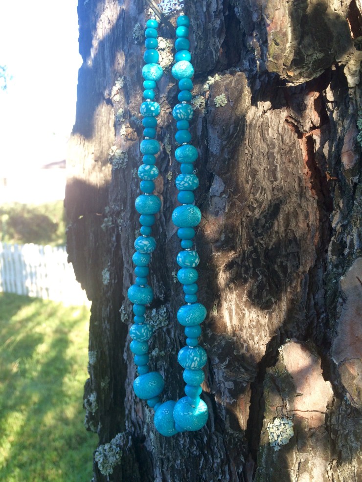 Just nu har jag fastnat för Fimolera! Det är kul att göra pärlor, men det tar hela kvällen när man väl satt igång. Så här blev det första försöket. Nu har det blivit pärlor till två nya halsband.