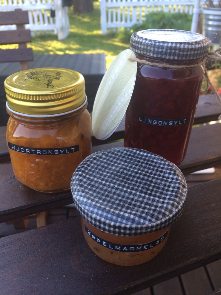 Jag har en vän som fyller år i augusti och jag bestämde mig för att pyssla något till henne. Jag letade fram bär ur frysen och några små glasburkar, och satte sedan igång med att koka sylt. Det blev tre olika sorter, och ett enkelt kort. Burklocken tejpade jag för att dölja blaffiga företagsnamn.