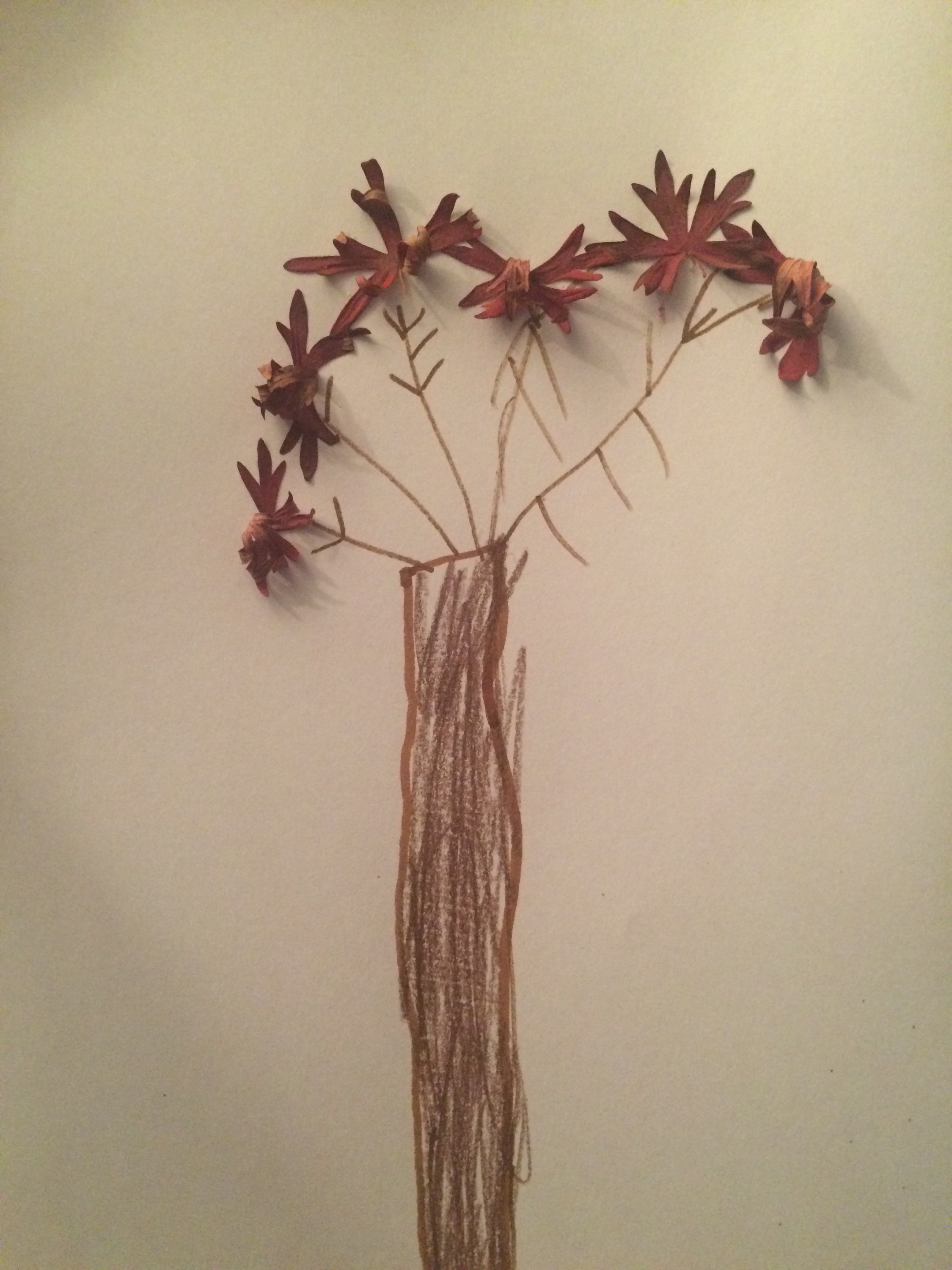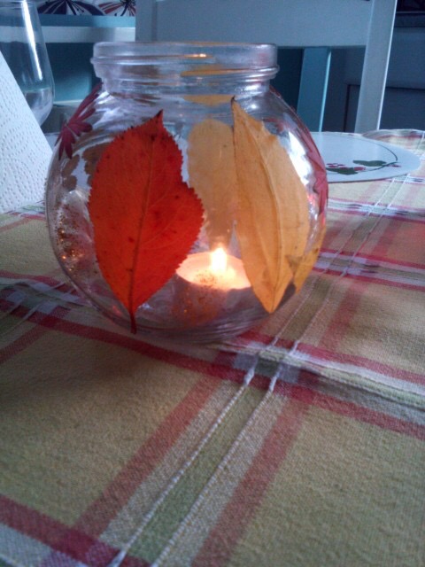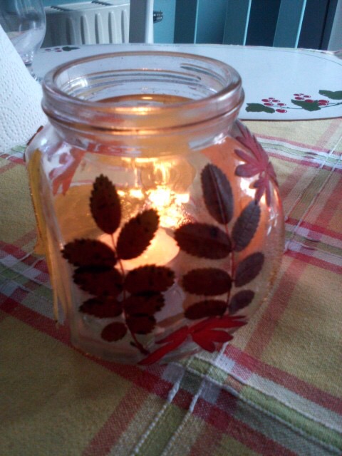 Här är systerdotter Mellemis bidrag. Ljuslyktor med höstlöv. Löven limmades fast med vanligt limstift på tomma glasburkar.