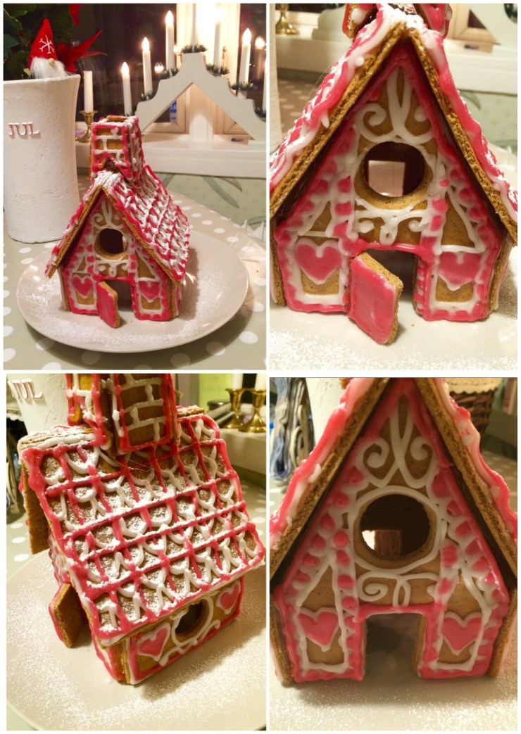 Vi pysslar inte bara till vår julkalender. Jag har bakat pepparkakor i helgen och jag gjorde bland annat ett hus utan att ha planerat det i förväg… Jag hade inget godis, men gjorde egen kristyr som jag dekorerade med. Grällt blev det, men smakar säkert bra ändå! 🙂 Nu får det dock först stå i ett förhoppningsvis dammfritt vitrinskåp ett tag.