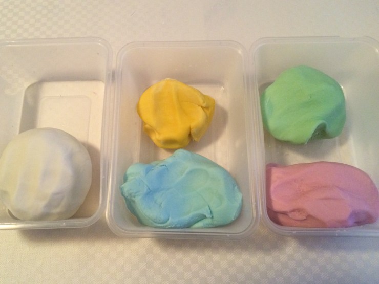 Jag brukar pyssla en del med Fimolera, men den är rätt dyr. Jag hittade recept på egen ”polymer clay” på Pinterest och bestämde mig för att testa. Här är ingredienserna, majsstärkelse, bikarbonat och karamellfärger (+vatten):