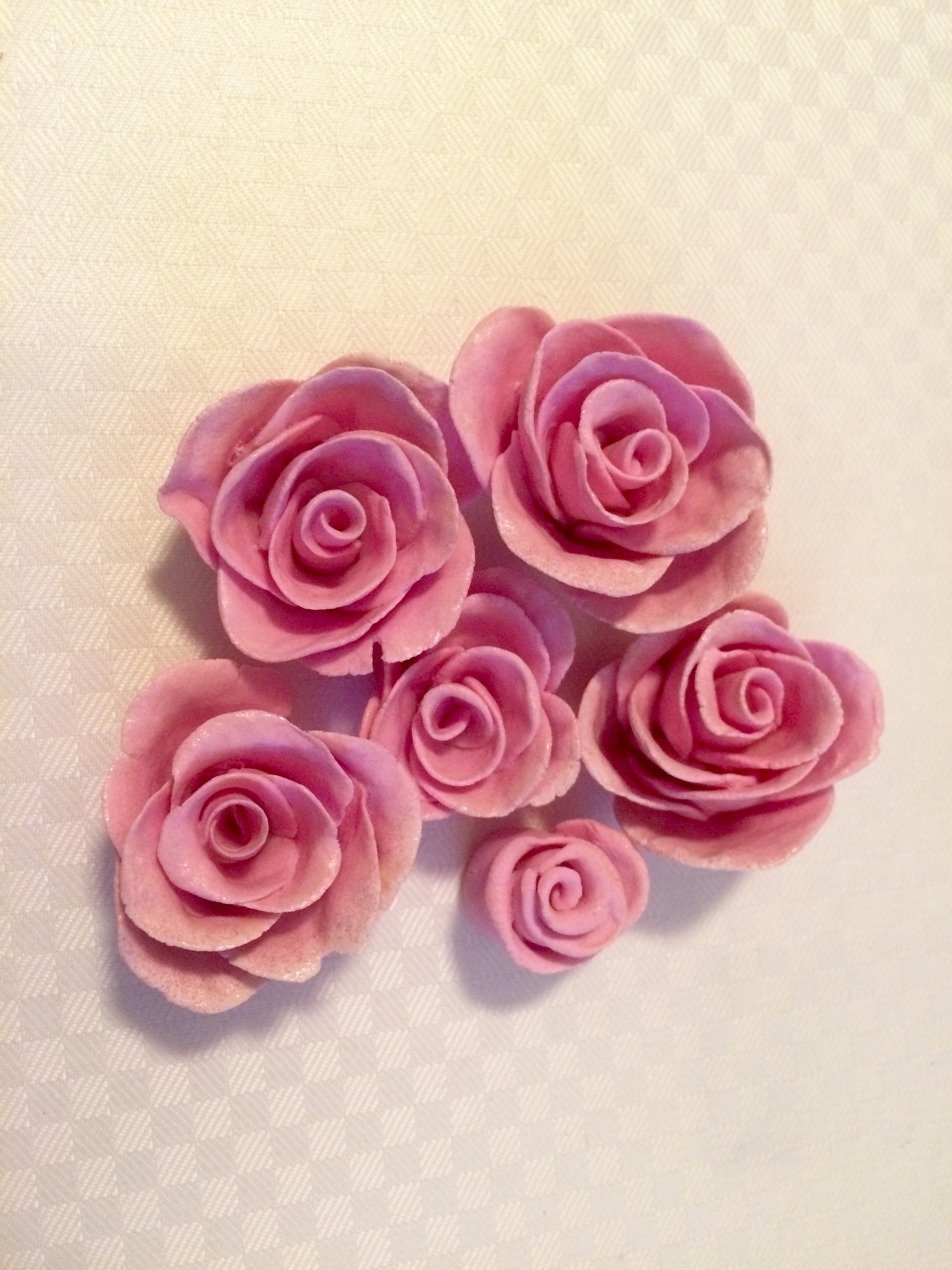Leran blir inte lika bra som köpt Fimolera, den är inte lika smidig, men den är lättarbetad och har en fin glittrig effekt av bikarbonatet. Ett plus är att den inte är farlig att äta om man pysslar med barn. Det går att göra rätt fina detaljer ändå. Dessa rosor gjorde jag av den rosa leran:
