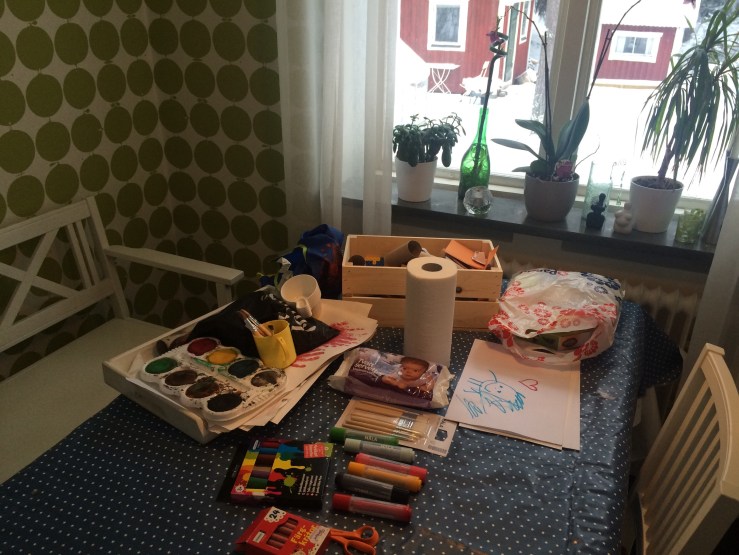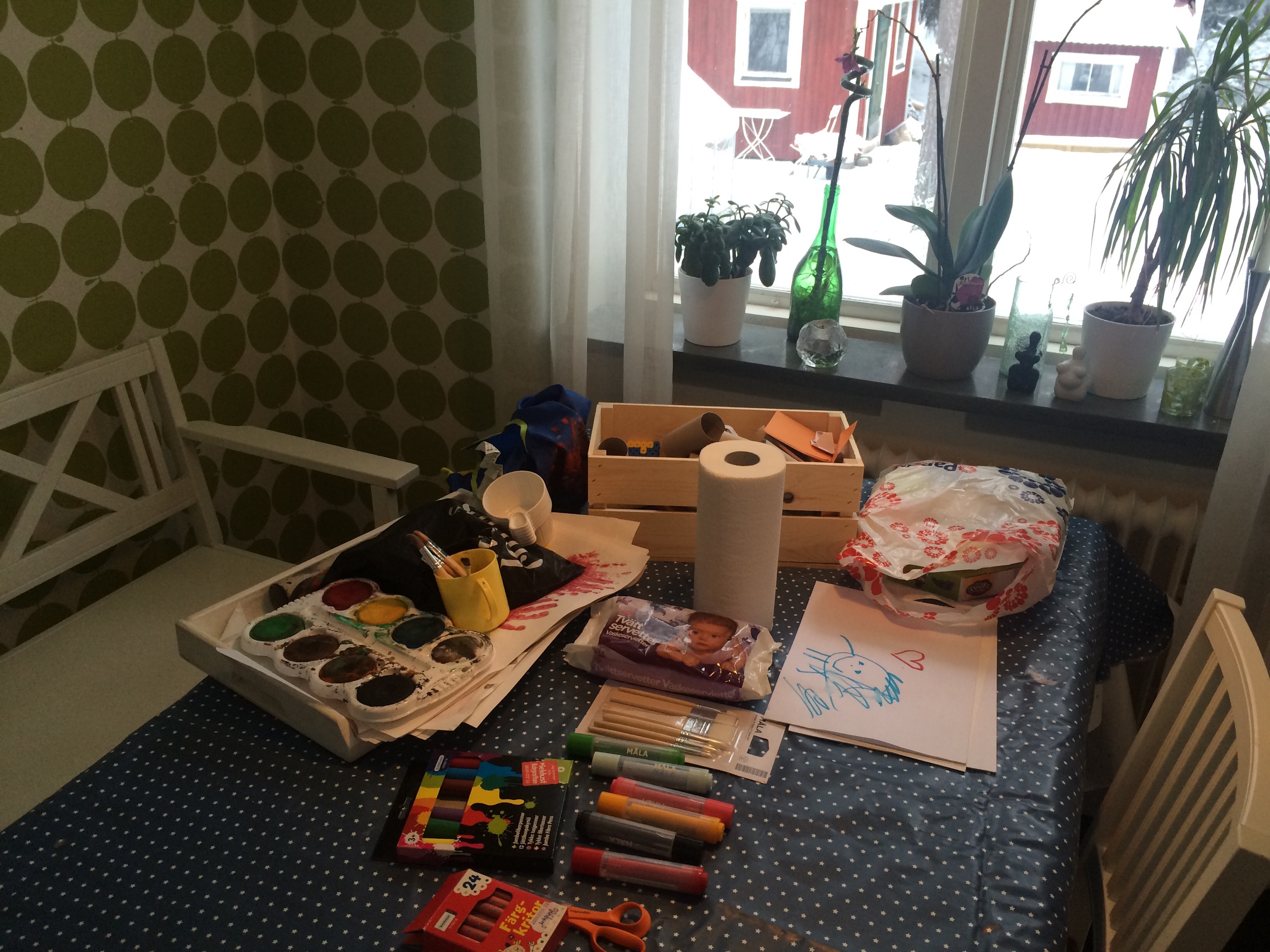 Min man är på skidtävling norr om Umeå i dag, så jag och John har bjudit in vänner för pysseldag. Inga planer på vad, helt fritt skapande. Vi får väl se hur det går med en nybliven treåring och en som snart är tre.