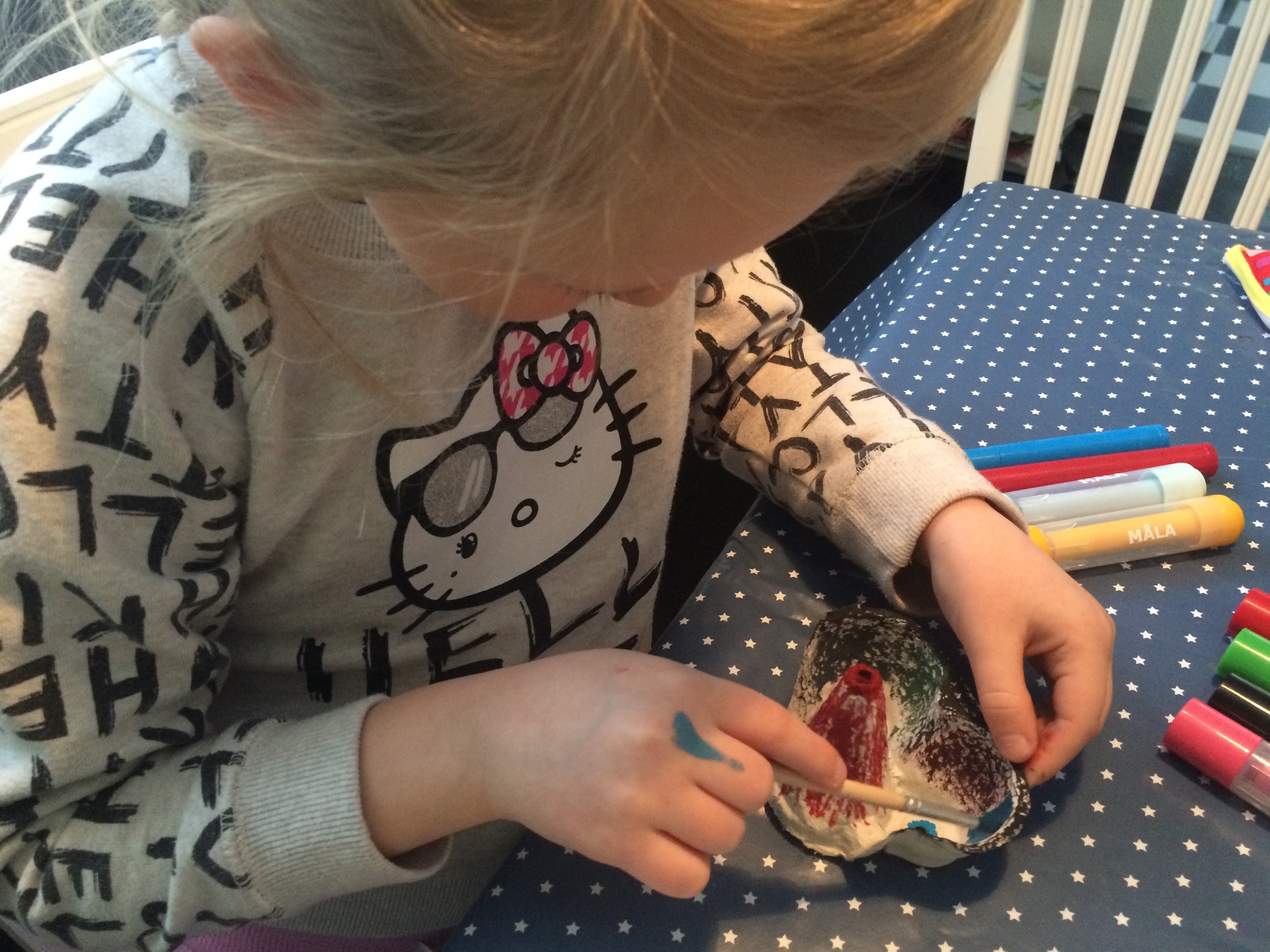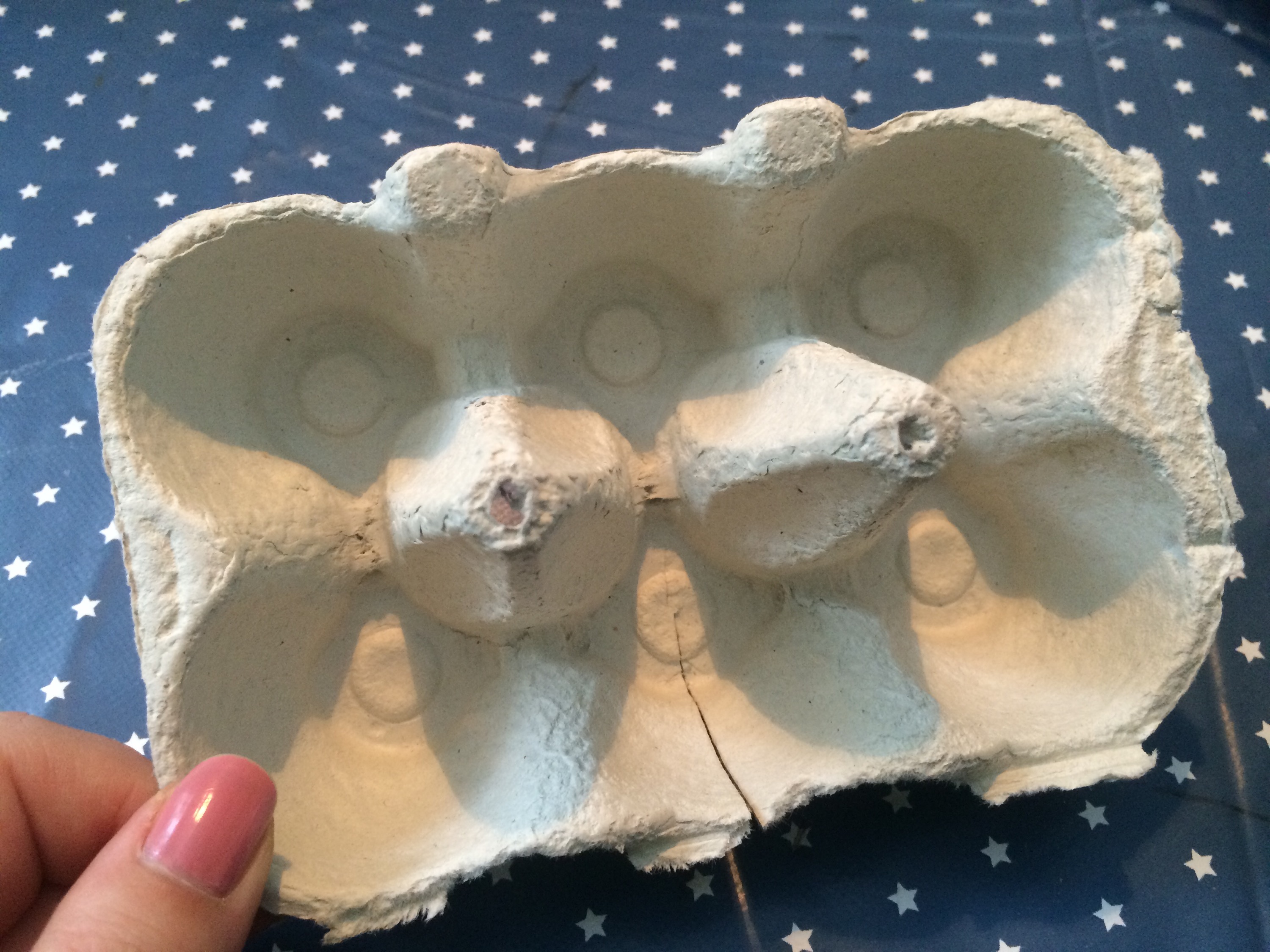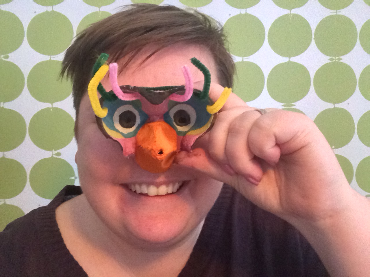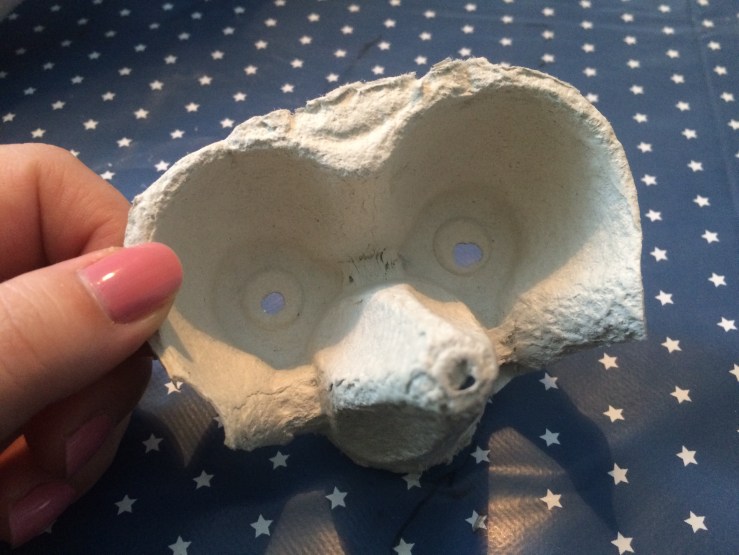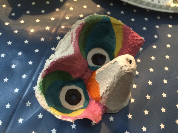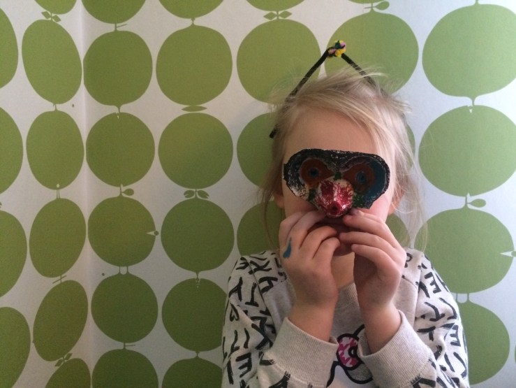 Jag och min systerdotter har varit kreativa med en äggkartong och gjort två maskeradmasker.