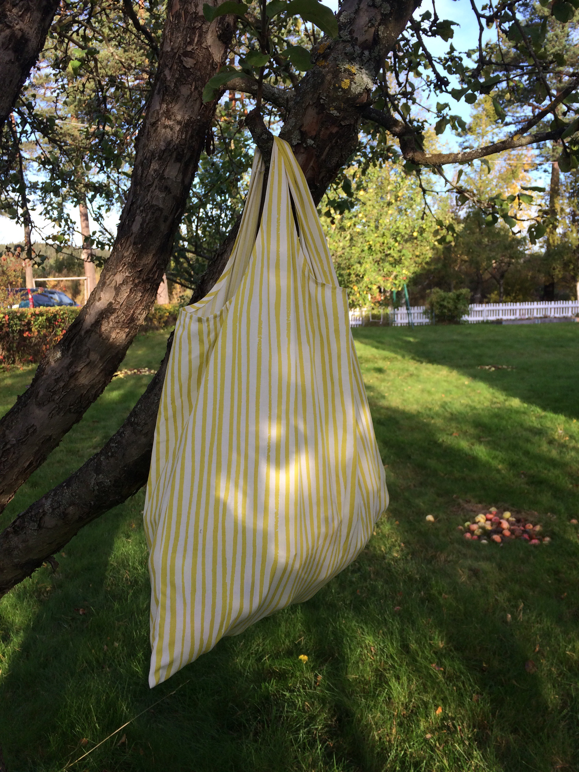 Här fick den fungera som äppelpåse när jag plockade äpplen hemma, men tanken är annars att ha den som matkasse istället för alla plastkassar man köper i onödan.