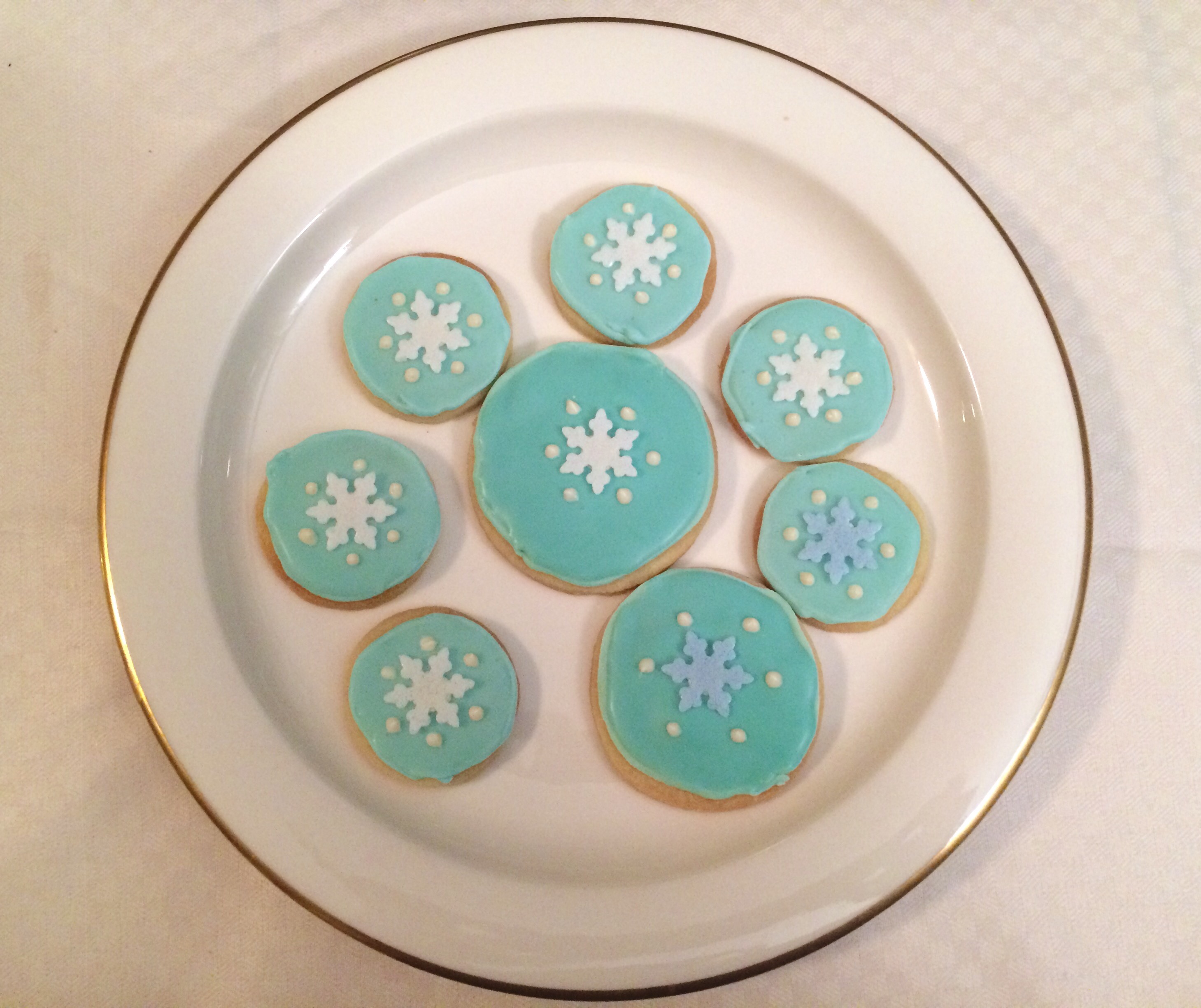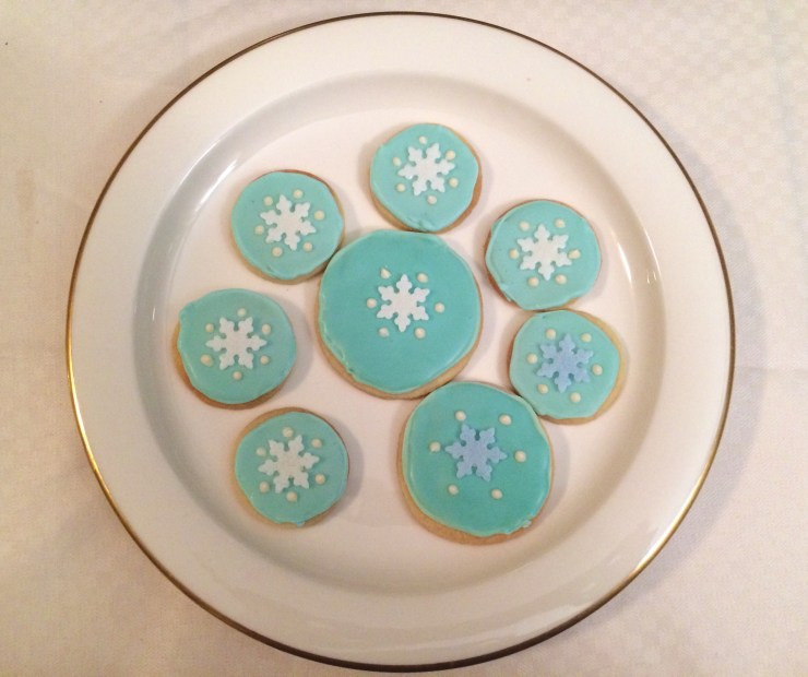 Jag gjorde också lite vintrigare kakor i blå kristyr, som jag la en köpt ätbar snöflingedekoration på.