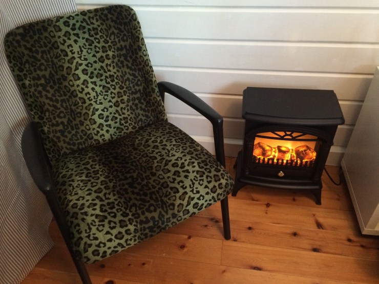 Nu när vi ändå var i stugan måste jag också lägga in en bild på en fåtölj som mamma målade och klädde om i present till mig för några år sedan, som står inne i friggeboden. Cool tycker jag!
