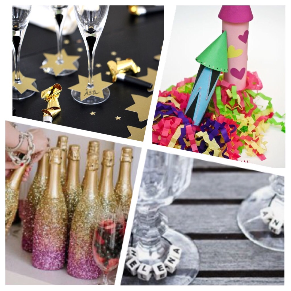 Här är lite nyårsinpiration som jag hittade på Pinterest: Nyårsraketer att pyssla med barnen, två enkla tips på hur man kan märka nyårsglasen inför kvällens fest och hur man kan piffa bubbelflaskorna med glitter.