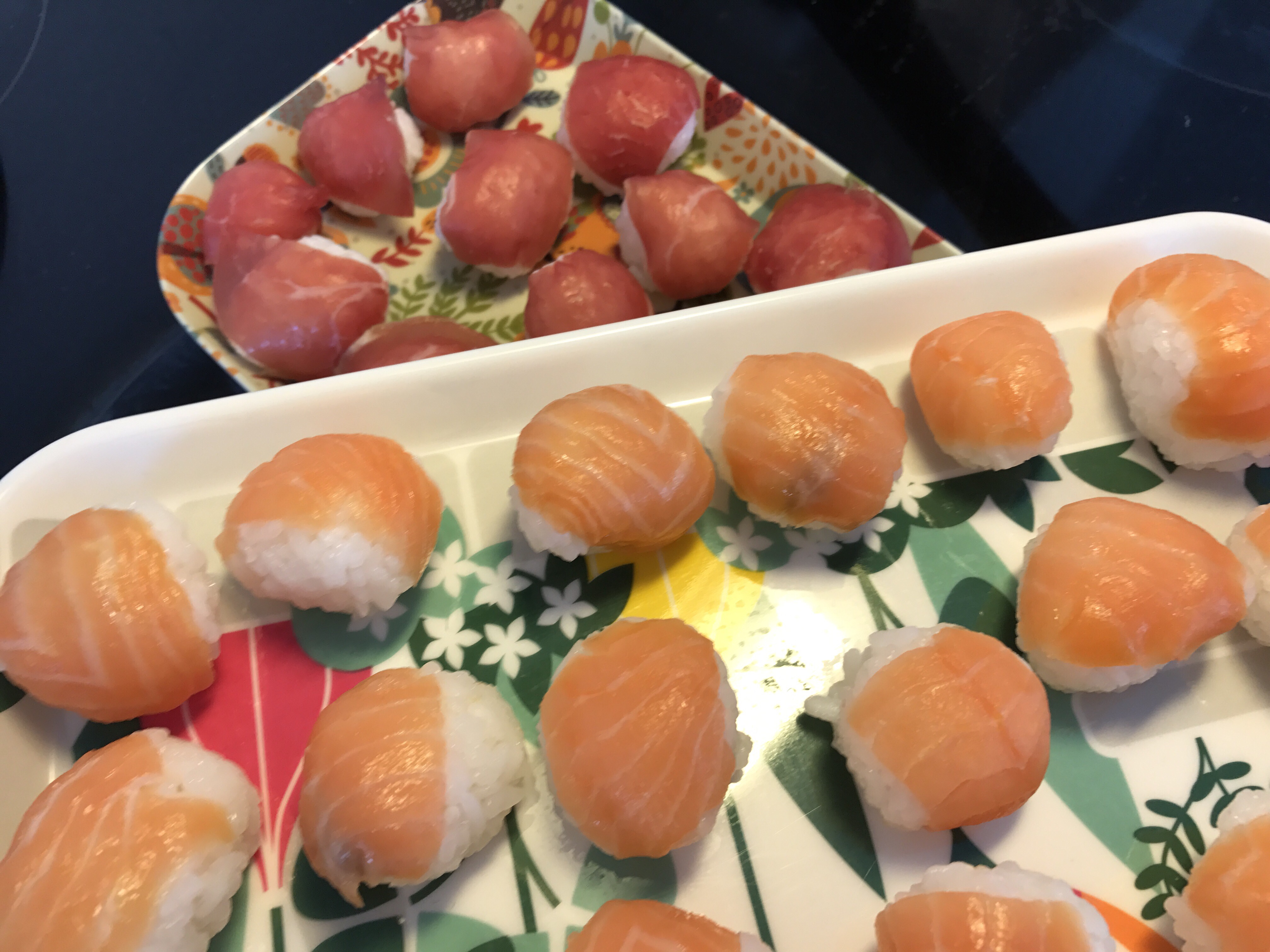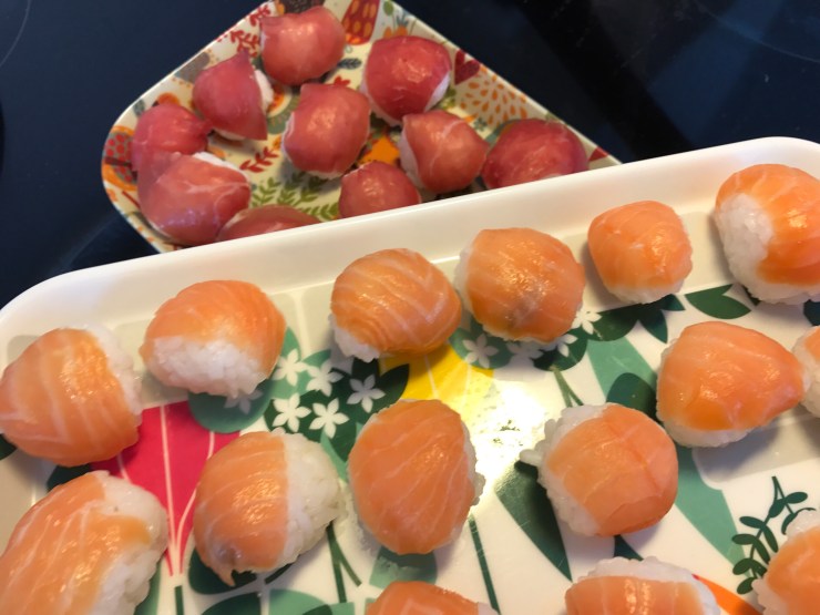 Ett tips: Sushiris är väldigt kladdigt. För att rulla fina bollar – lägg valfri topping på en bit plastfolie, lägg på en sked ris, tryck ihop bollen med plast runt om och du slipper ris som fastnar som klister på fingrarna.