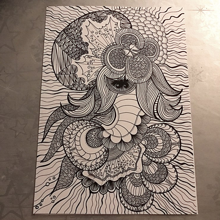 Det är fascinerande att börja med en cirkel eller en linje eller bara en prick. Rensa tankarna och fortsätt fylla pappret. Tänk inte på vad du gör. Känn. Ett streck kan bli fel, kännas fult. Kanske ångrar du det strecket. Men fortsätt. Det behöver inte bli fint. Fyll pappret. Oftast blir det fula strecket fint till slut. Om inte, så vad gör det. Det var avkopplande att rita.