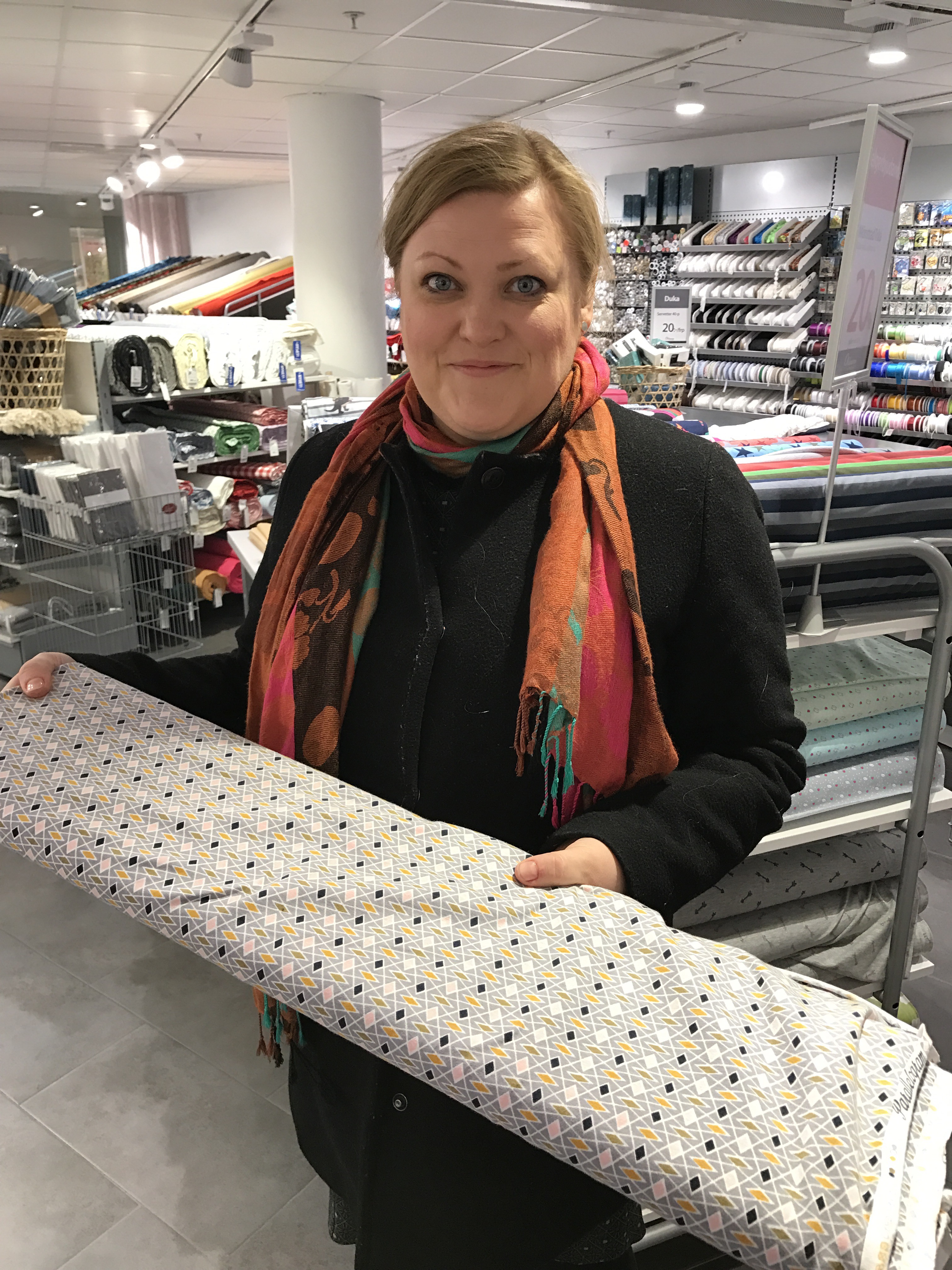 Sara köpte två snygga tyger för att göra hårband.