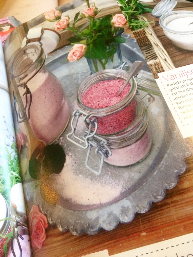 Jag köpte en tidning tidigare i vår som var i min smak. Den hette älskade trädgård och hade bland annat tips om hur man kan göra smaksatt salt och socker, som vaniljsocker, rosensocker, lavendelsocker och vitlökssalt med örter. Dels gillar jag tanken på att skörda det man själv odlat och använda som smaksättning, dels var de väldigt fina – rosa och lilafärgade. De skulle säkert vara fina presenter att ge bort också!