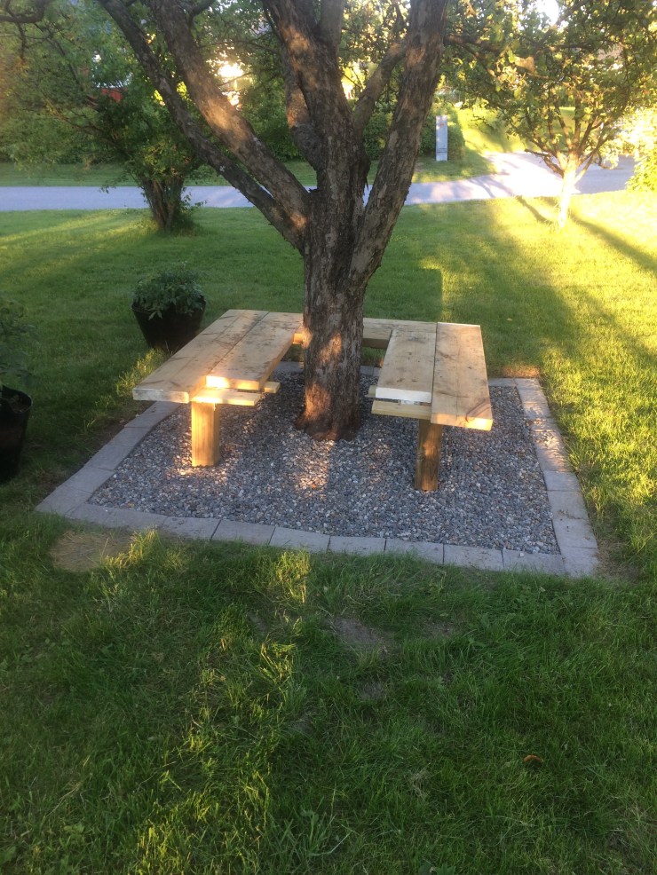 Jag har kommit en bit på mitt projekt med att bygga en bänk runt ett av äppelträden! Tänk vad en kväll utan regn kan göra… 🙂 Det blir lite snett och vint, men det är å andra sidan första gången jag försöker mig på något liknande. Jag använder också överblivna bitar, så det gör inte så mycket om det inte blir bra. Den blir funktionell i alla fall, så jag är ändå rätt nöjd! Kanske kan jag göra klart sista biten ikväll.