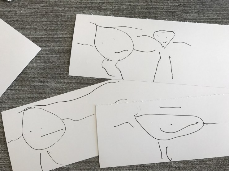 Fyra år och äntligen har han börjat rita lite smått. Huvudfotingarna är så söta. Här har han ritat några av pedagogerna.