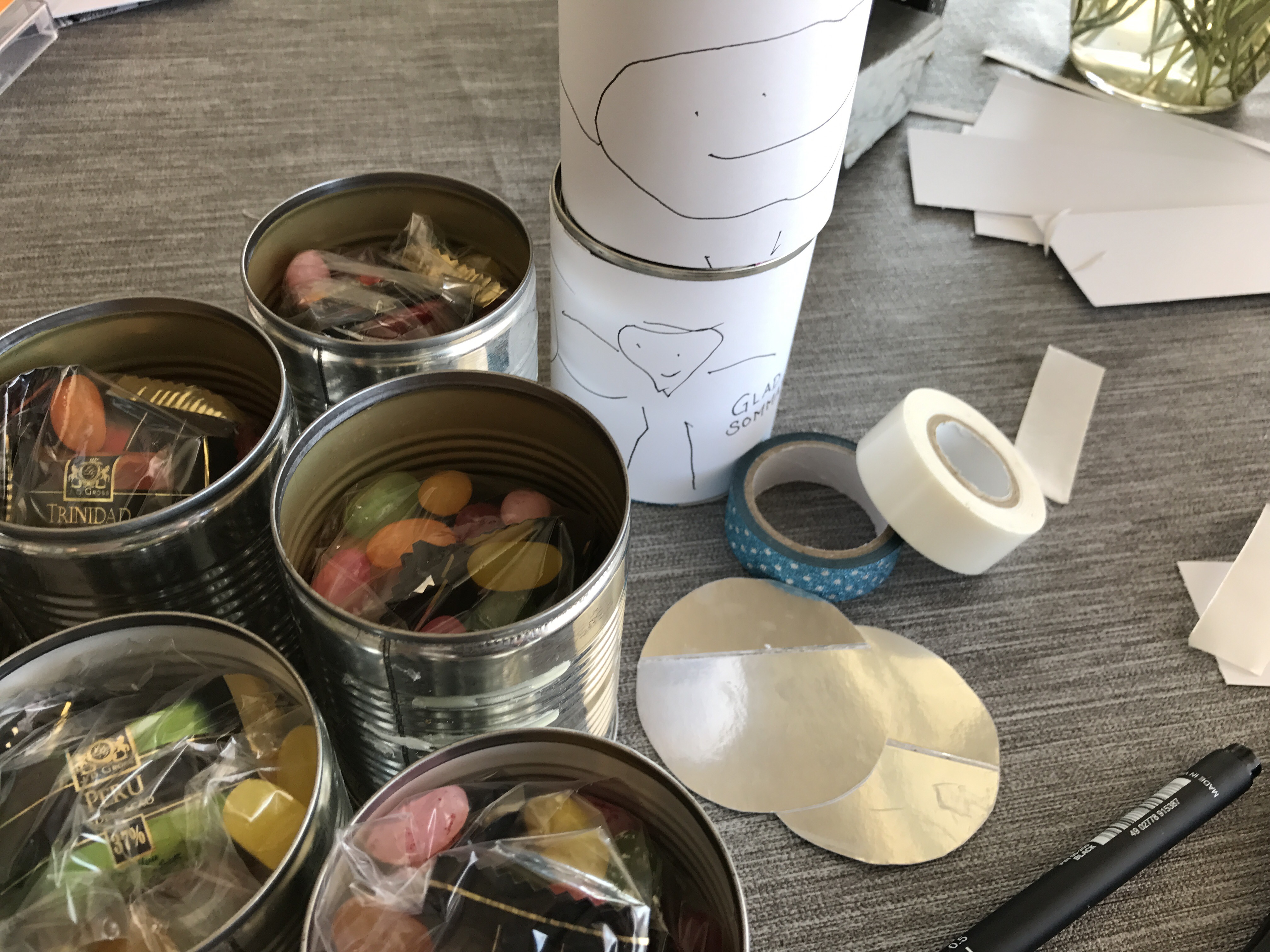 Vi bestämde oss för att göra små godispaket av konservburkar. Öppna burkarna underifrån och diska. Fyll med godis och tejpa ny botten till burken, och pynta.
