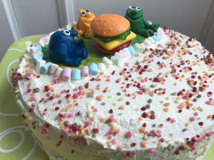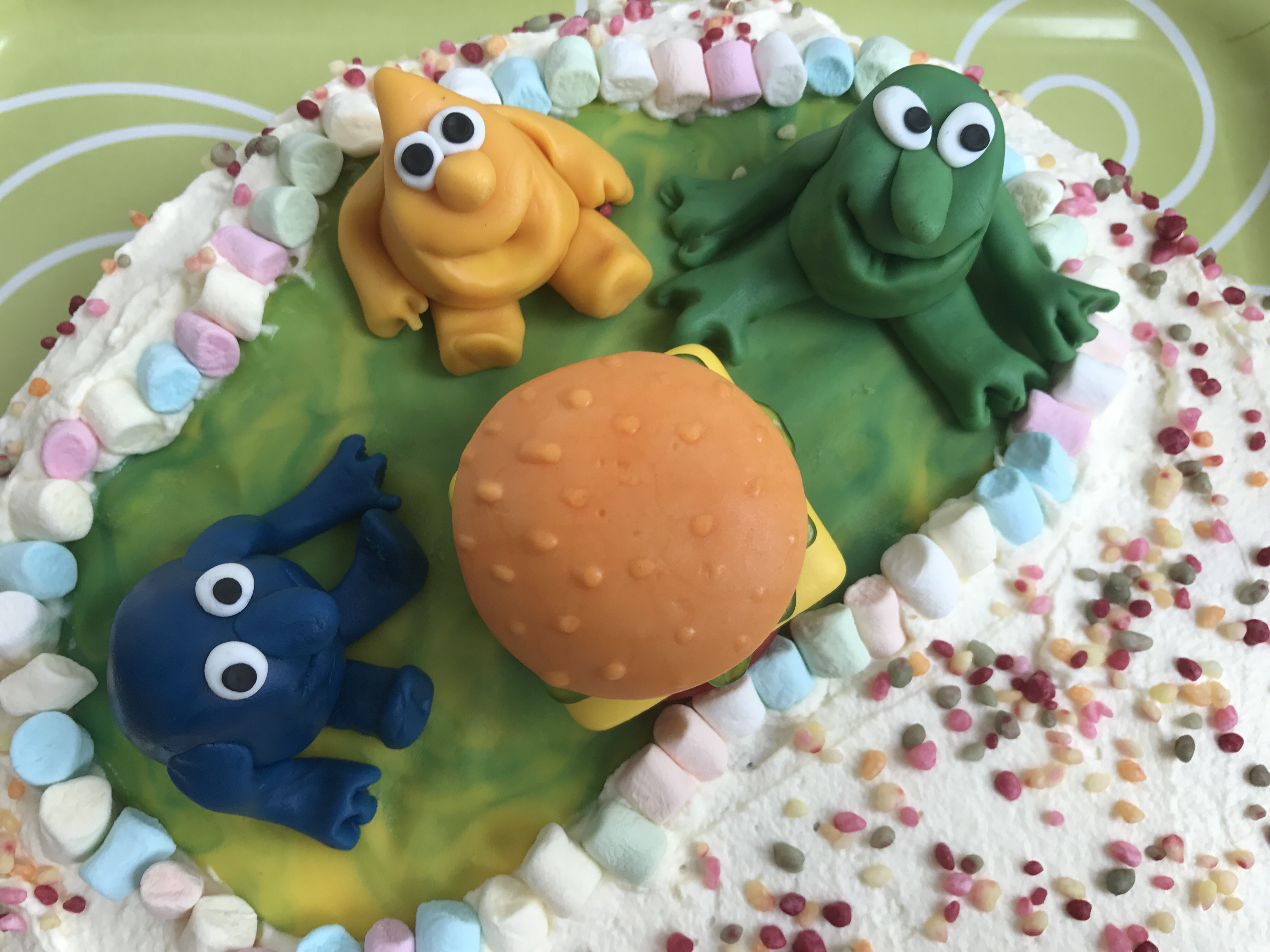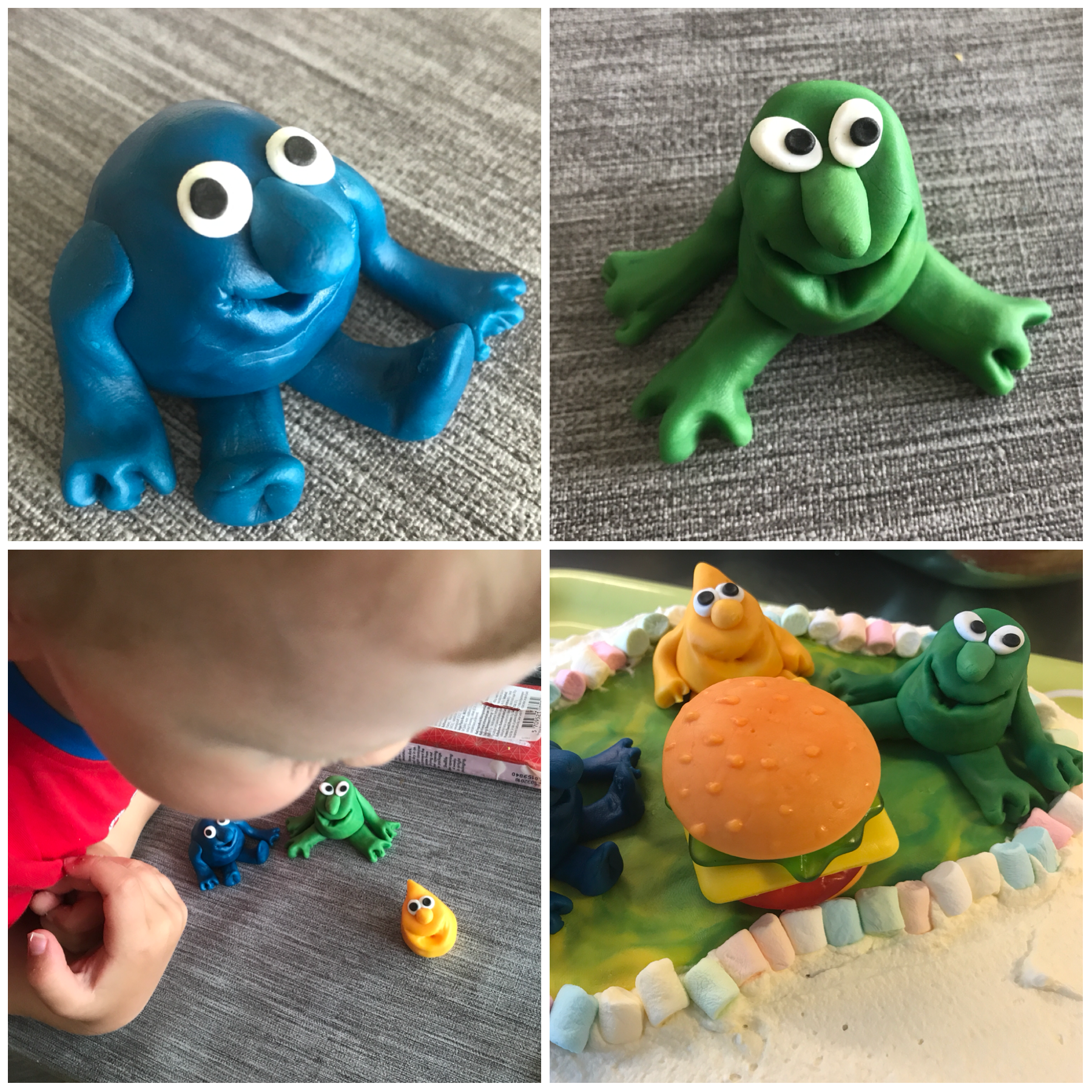 Och när sonen fick välja vilket bak som helst sa han så klart tårtbak. Jag är inte den som kan säga nej till det. Genast satte vår fantasi i gång. På Netflix finns ett barnprogram med lerfigurer som heter Plonsters – en plonstertårta fick det bli i dag.