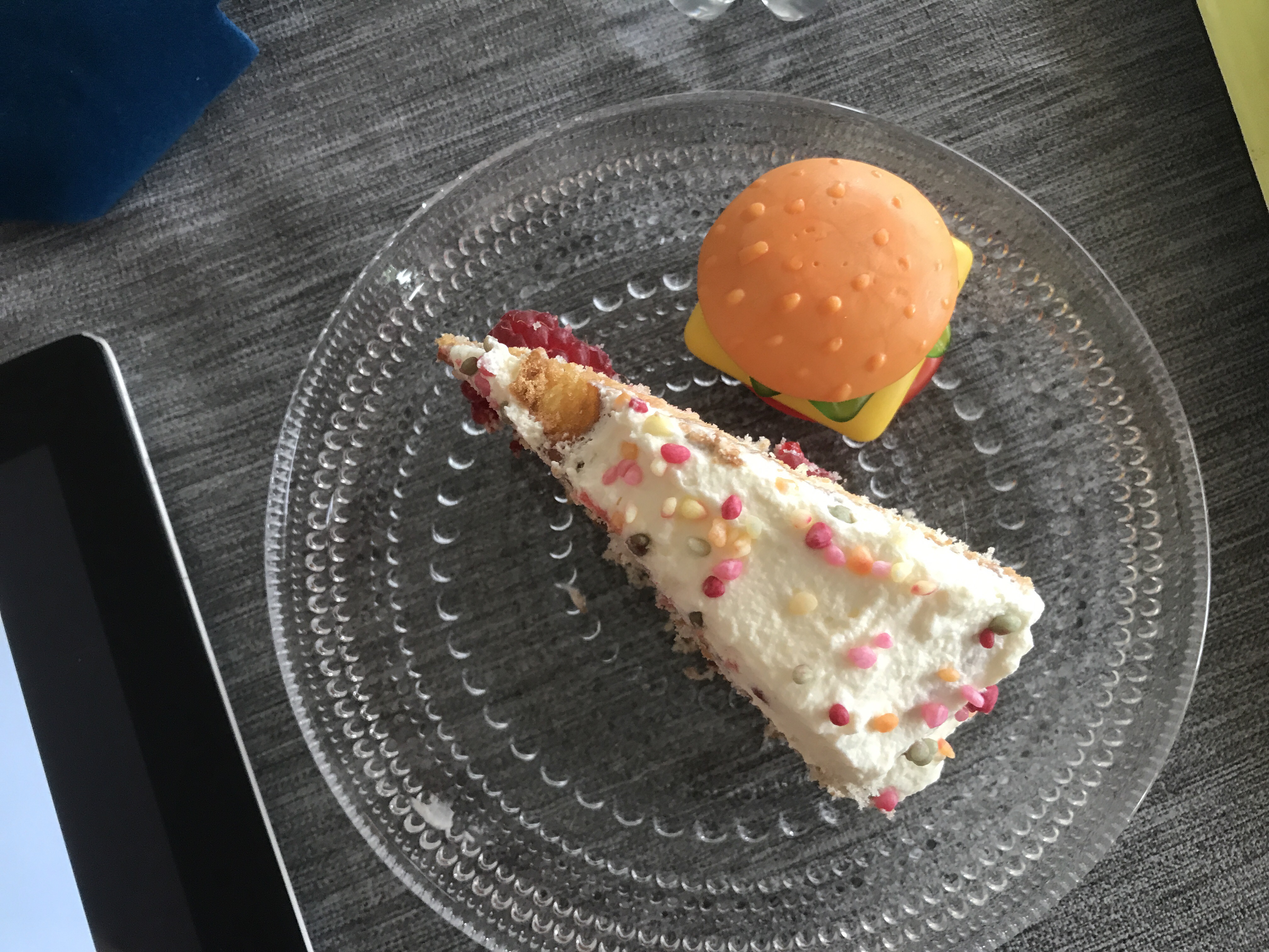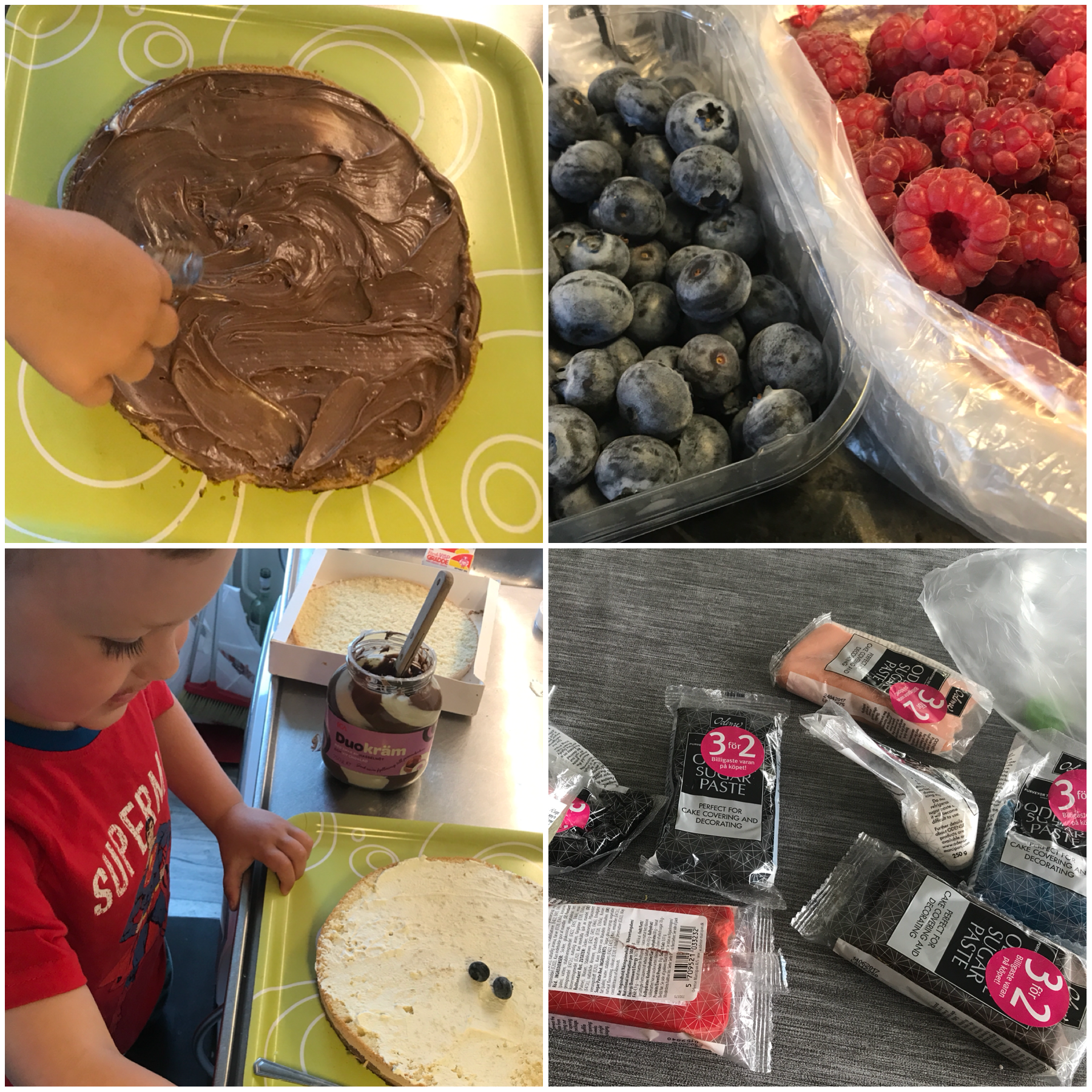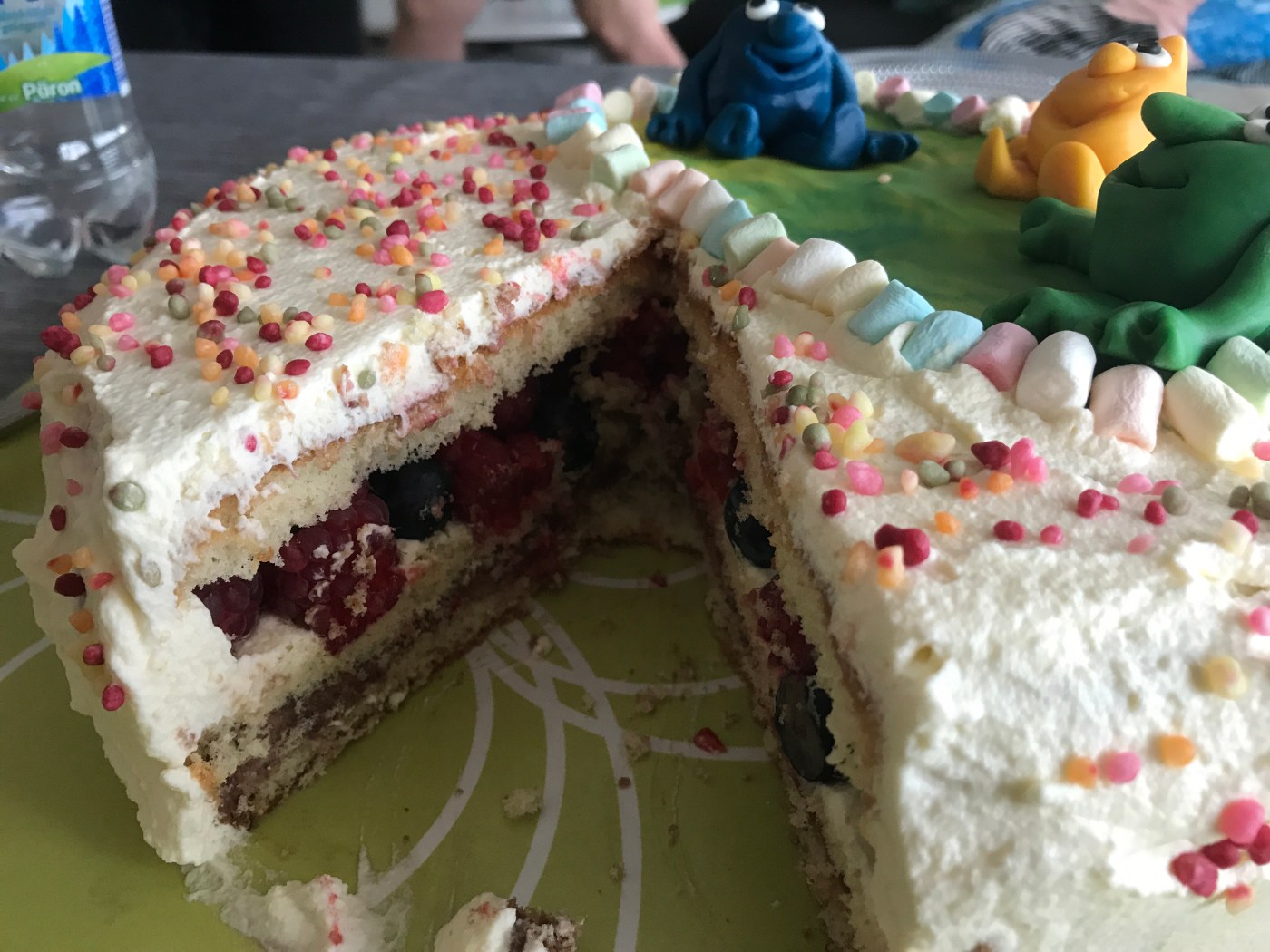 Färdig tårtbotten fick det bli. Ett lager duokräm och ett lager hallon och blåbär. På det grädde, sockerpasta, strössel och lite godisrester från lördagen.