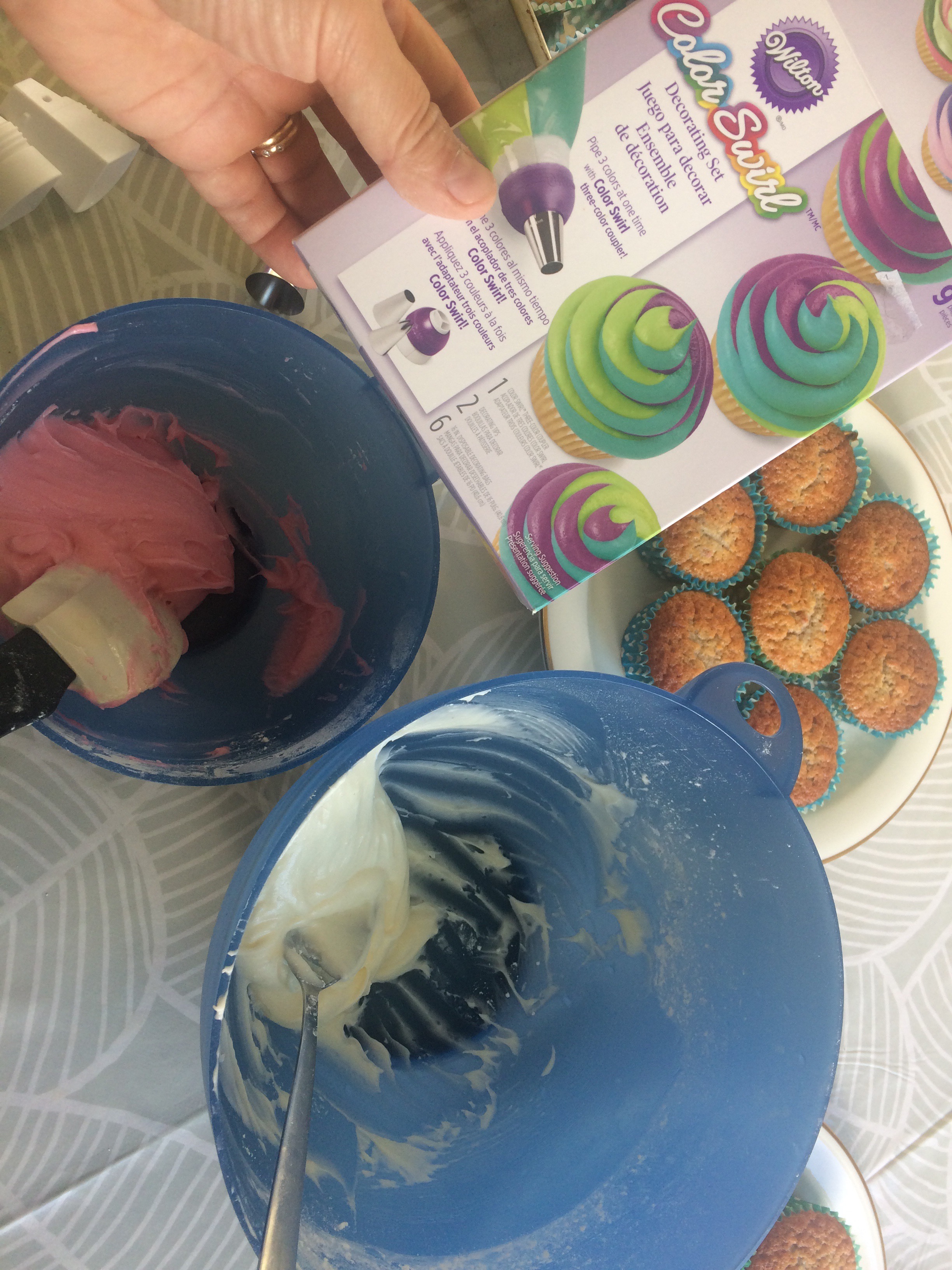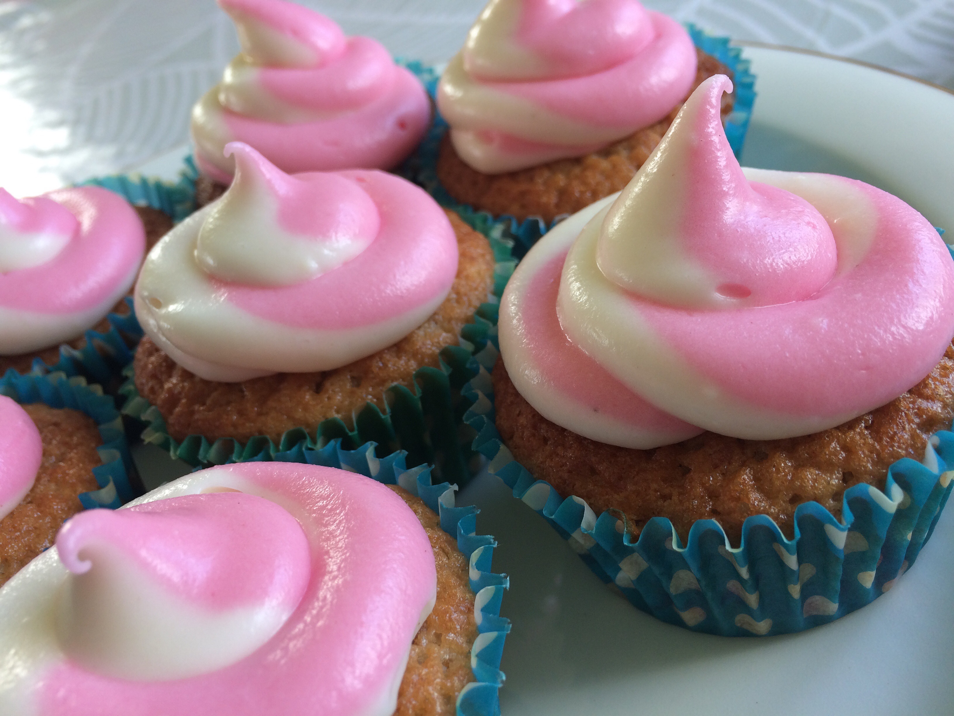 Nu testade jag med två färger – vitt och rosa. Tänkte att det kunde passa till hallonmuffinsen jag bakat.