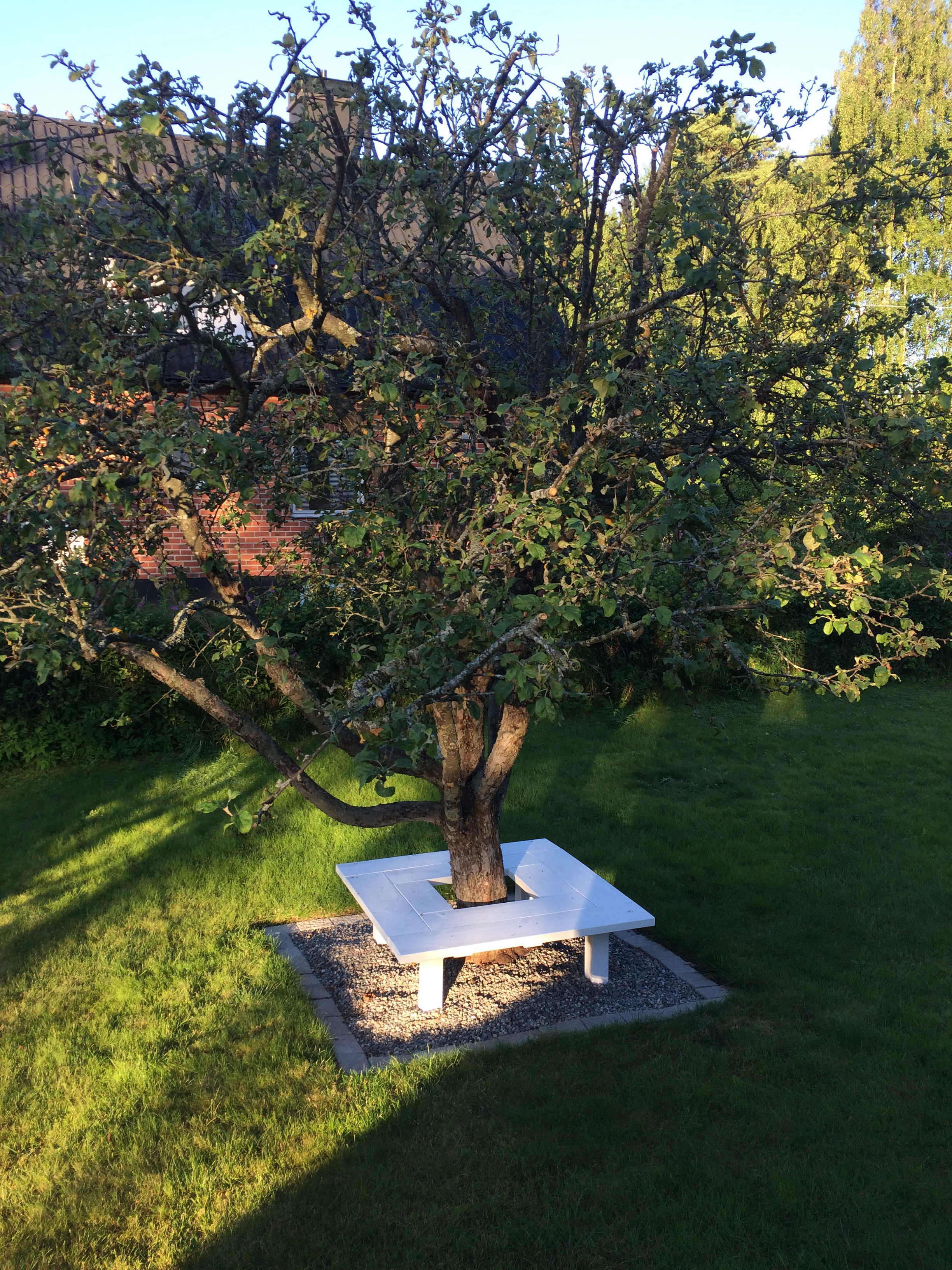 Jag la tidigare i sommar ut en bild på bänken jag byggt runt ett av mina äppelträd. Nu är den färdigbyggd och dessutom färdigmålad! Jag är definitivt inget byggproffs, så den klarar kanske inte någon närmare inspektion, men den funkar och jag är ändå nöjd!