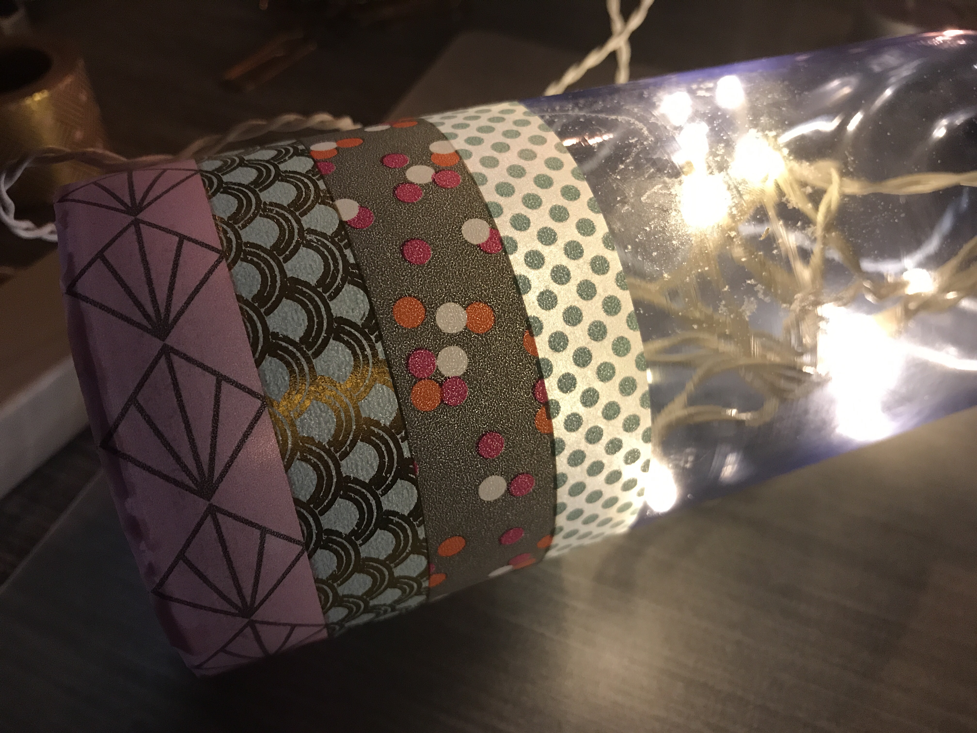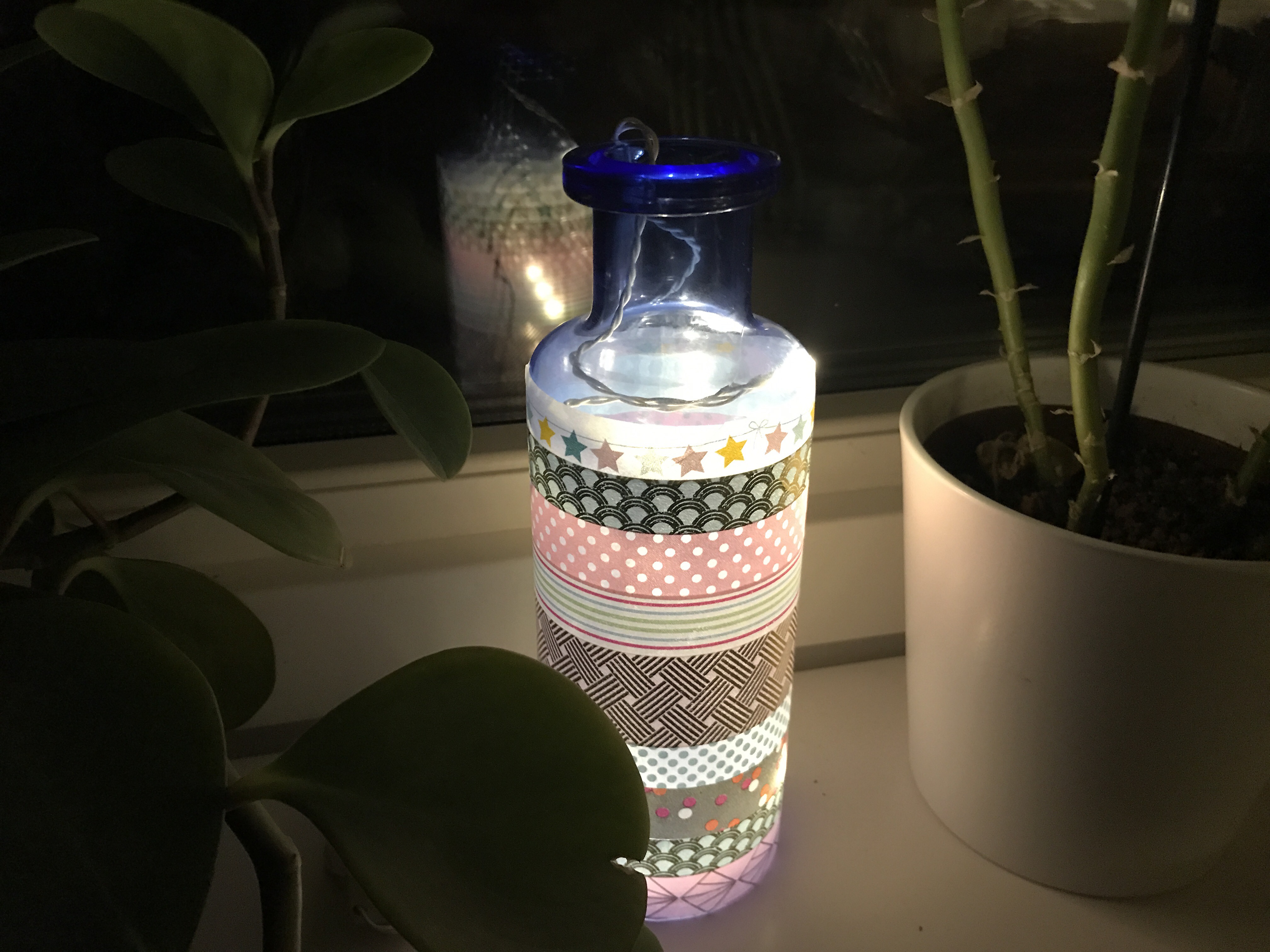 Med en ljusslinga, glasflaska och lite washitejp skapade jag häromkvällen en ljuslykta.