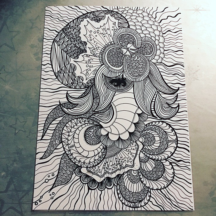 Det här är min första doodle som fyller hela sidan. Jag vet inte vad det föreställer, men ofta tycker jag att mina krumelurer liknar utomjordiska havsdjur eller sagolika växter. Min son har döpt teckningarna hittills: den första blev ”Timrå simhall”. Haha. Andra ser en elefant.