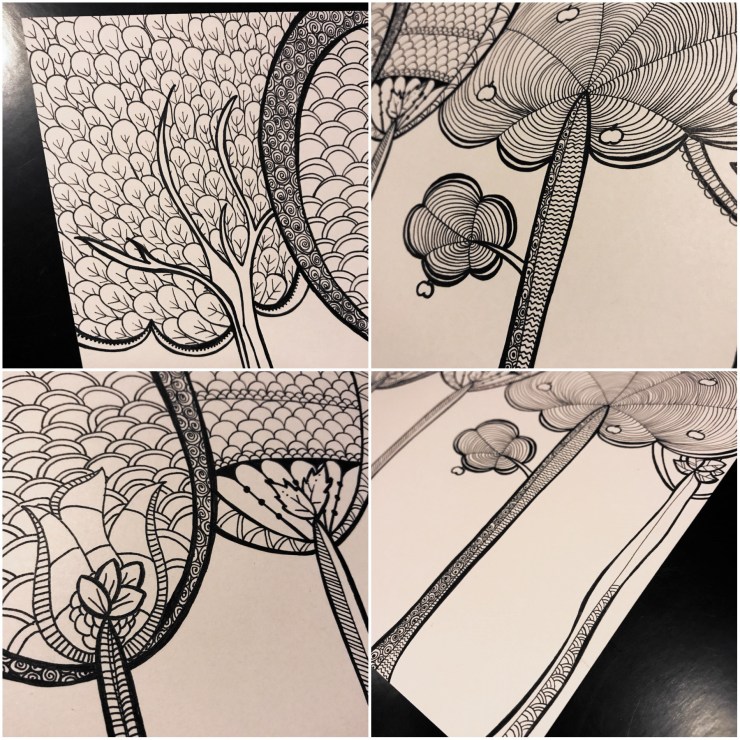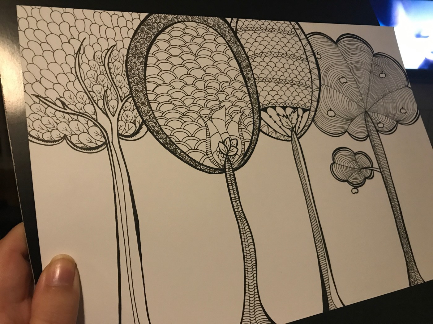 Just nu sitter jag i soffan framför teven och försöker klottra med ett mål – doodla träd. Mycket svårare, för då kan det ju bli fel! Jag fastnar ofta och bara stirrar på ytan som ska fyllas med något mönster och jag vet inte om jag vågar fortsätta. Ändå fortsätter jag, sakta men säkert. Är nästan besatt av teckningen. Jag tänker på mönster och krumelurer när jag somnar – och när jag vaknar.
