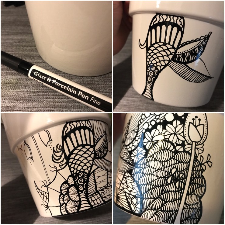 Så rogivande att bara låta sig föras iväg av pennan. Så klart svårare på porslin. Du måste ta pauser så att det hinner torka lite, annars kladdas färgen bara ut när du håller i krukan.